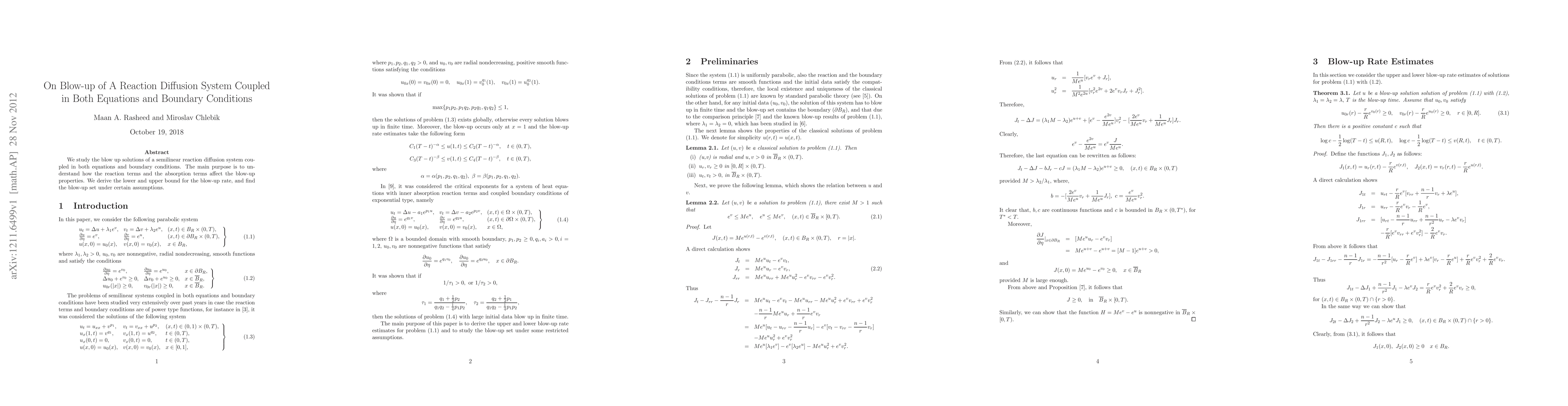 This paper investigates the blow-up behavior of a semilinear reaction diffusion system where both equations and boundary conditions are coupled. It derives lower and upper bounds for the blow-up rate and identifies the blow-up set under specific assumptions.