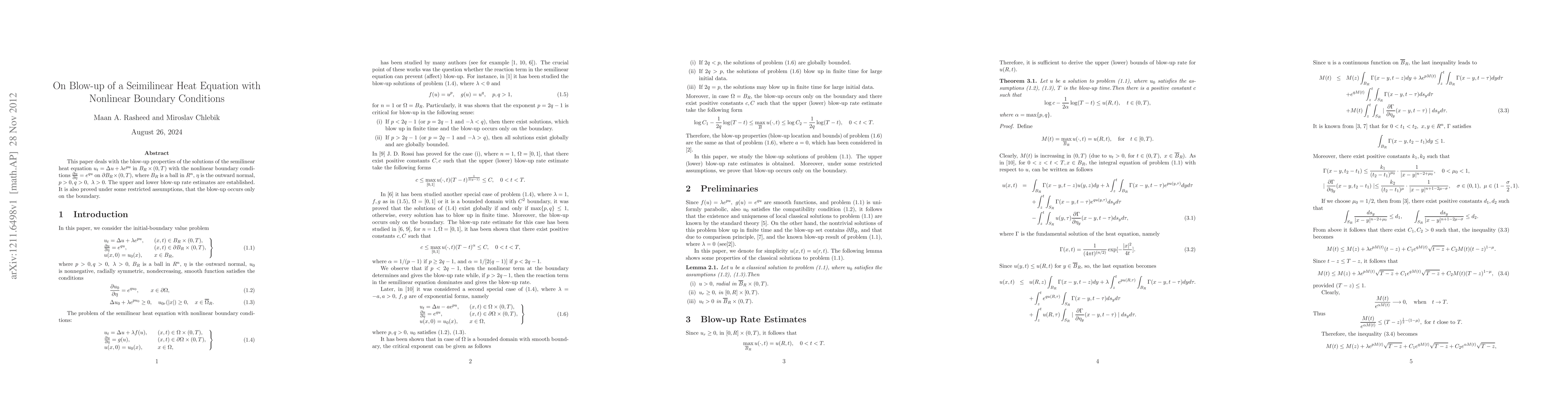 Summary: This research investigates the conditions under which solutions to a semilinear heat equation with nonlinear boundary conditions exhibit blow-up behavior. It examines the mechanisms leading to finite-time blow-up and identifies critical thresholds that determine the solution's behavior.