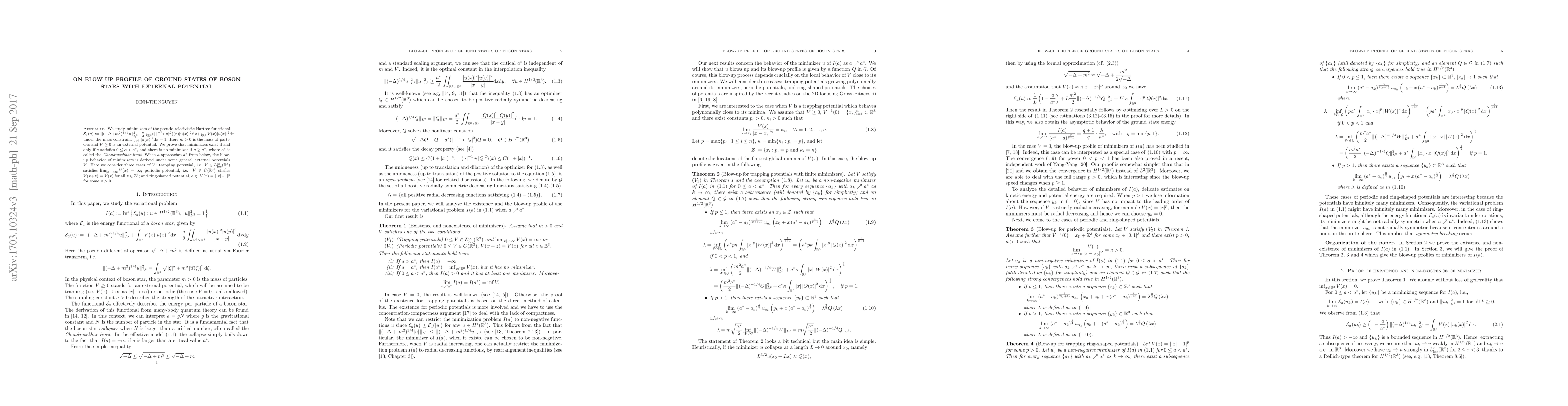 This paper investigates the existence and blow-up behavior of ground states for boson stars under an external potential, proving that minimizers exist if $a$ is below the Chandrasekhar limit $a^*$. It derives blow-up profiles for minimizers approaching $a^*$ under three types of external potentials: trapping, periodic, and ring-shaped.