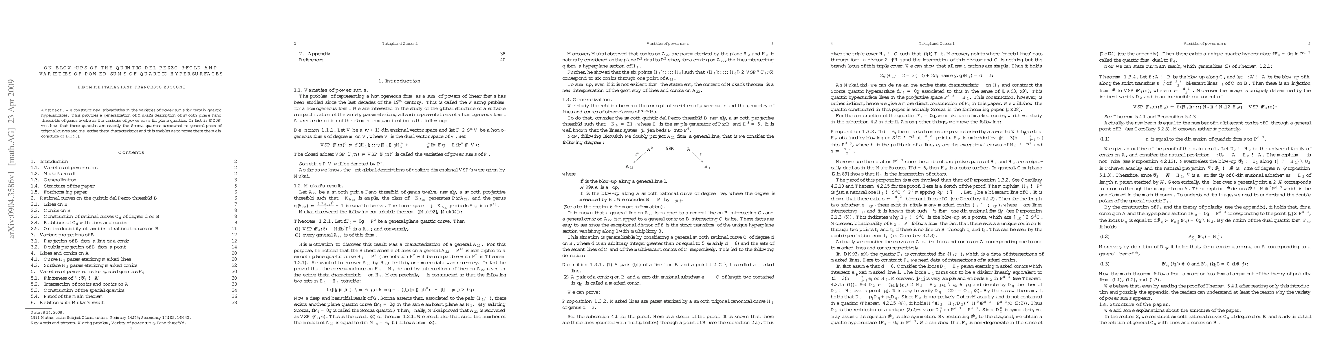 We construct new subvarieties in the varieties of power sums for certain quartic hypersurfaces. This provides a generalization of Mukai's description of smooth prime Fano threefolds of genus twelve as the varieties of power sums for plane quartics. In fact, in our second paper, we show that these quartics are exactly the Scorza quartics associated to general pairs of trigonal curves and ineffective theta characteristics and this enables us to prove there the main cojecture of Dolgachev and Kanev.