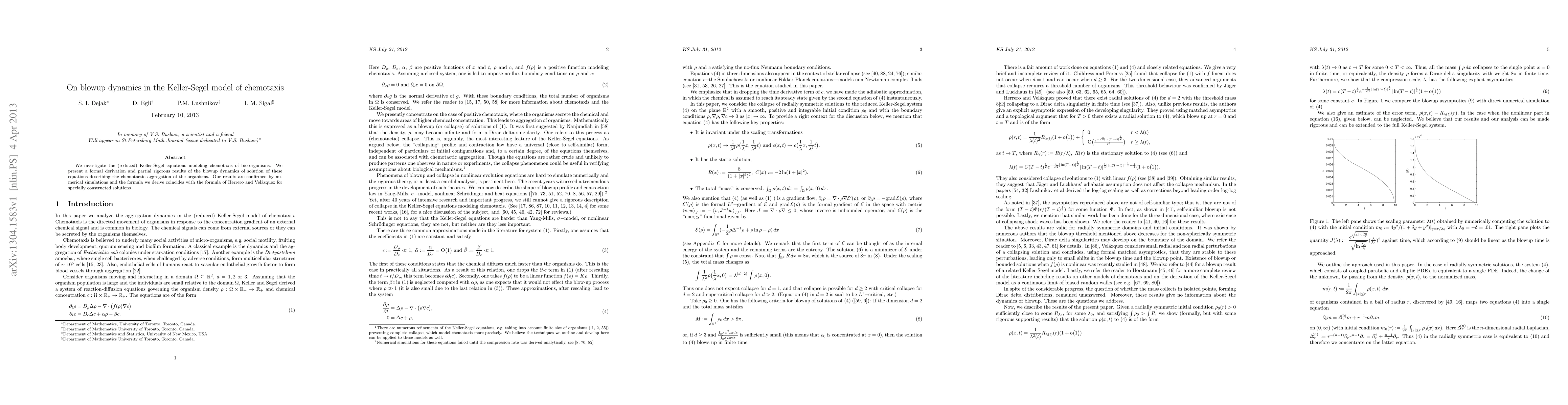 We investigate the (reduced) Keller-Segel equations modeling chemotaxis of bio-organisms. We present a formal derivation and partial rigorous results of the blowup dynamics of solution of these equations describing the chemotactic aggregation of the organisms. Our results are confirmed by numerical simulations and the formula we derive coincides with the formula of Herrero and Vel\'{a}zquez for specially constructed solutions.