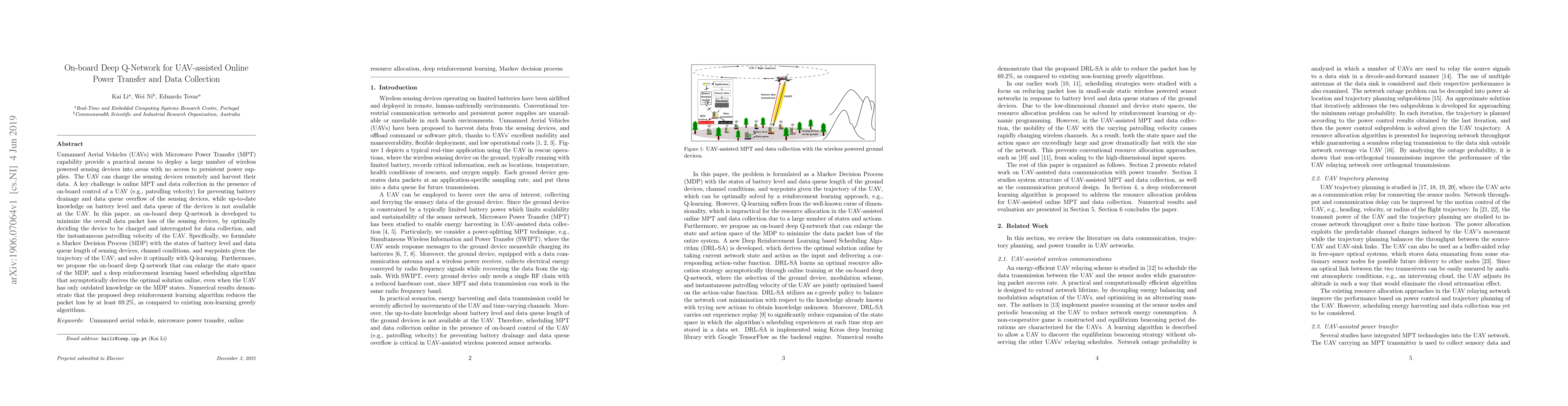 Unmanned Aerial Vehicles (UAVs) with Microwave Power Transfer (MPT) capability provide a practical means to deploy a large number of wireless powered sensing devices into areas with no access to persistent power supplies. The UAV can charge the sensing devices remotely and harvest their data. A key challenge is online MPT and data collection in the presence of on-board control of a UAV (e.g., patrolling velocity) for preventing battery drainage and data queue overflow of the sensing devices, while up-to-date knowledge on battery level and data queue of the devices is not available at the UAV. In this paper, an on-board deep Q-network is developed to minimize the overall data packet loss of the sensing devices, by optimally deciding the device to be charged and interrogated for data collection, and the instantaneous patrolling velocity of the UAV. Specifically, we formulate a Markov Decision Process (MDP) with the states of battery level and data queue length of sensing devices, channel conditions, and waypoints given the trajectory of the UAV; and solve it optimally with Q-learning. Furthermore, we propose the on-board deep Q-network that can enlarge the state space of the MDP, and a deep reinforcement learning based scheduling algorithm that asymptotically derives the optimal solution online, even when the UAV has only outdated knowledge on the MDP states. Numerical results demonstrate that the proposed deep reinforcement learning algorithm reduces the packet loss by at least 69.2%, as compared to existing non-learning greedy algorithms.