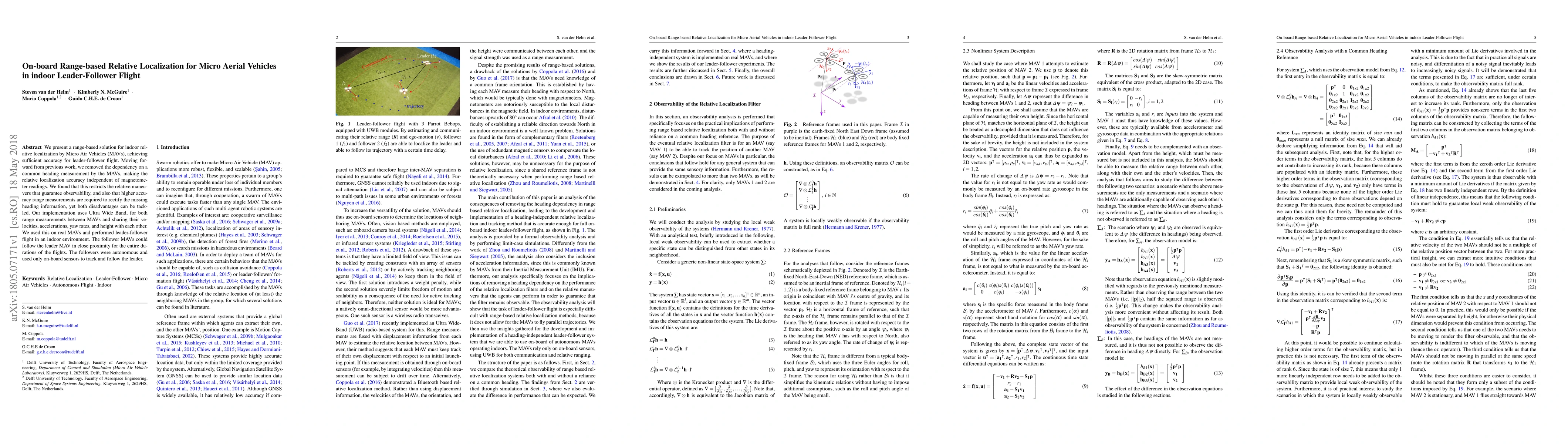 This paper proposes a range-based localization method for indoor leader-follower flight of Micro Aerial Vehicles (MAVs) that eliminates the need for common heading measurements, enhancing localization accuracy. The method uses Ultra Wide Band for precise range measurements and data sharing, enabling autonomous follower MAVs to accurately track the leader without relying on magnetometers.