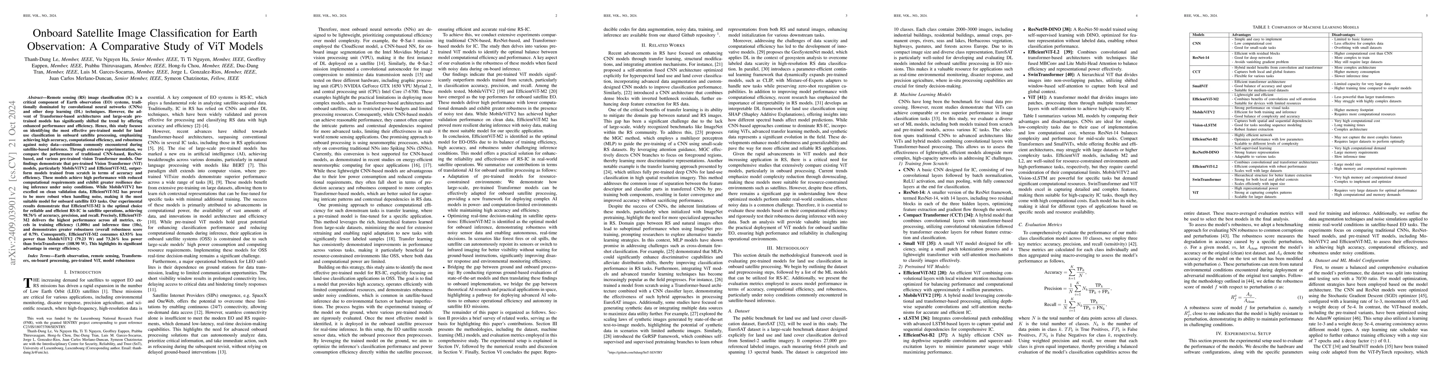 This study compares pre-trained vision Transformer models for satellite image classification, finding that EfficientViT-M2 outperforms traditional CNNs in accuracy, efficiency, and noise resilience. EfficientViT-M2 achieves 98.76% accuracy and demonstrates superior training efficiency and robustness, making it optimal for onboard satellite Earth observation tasks.