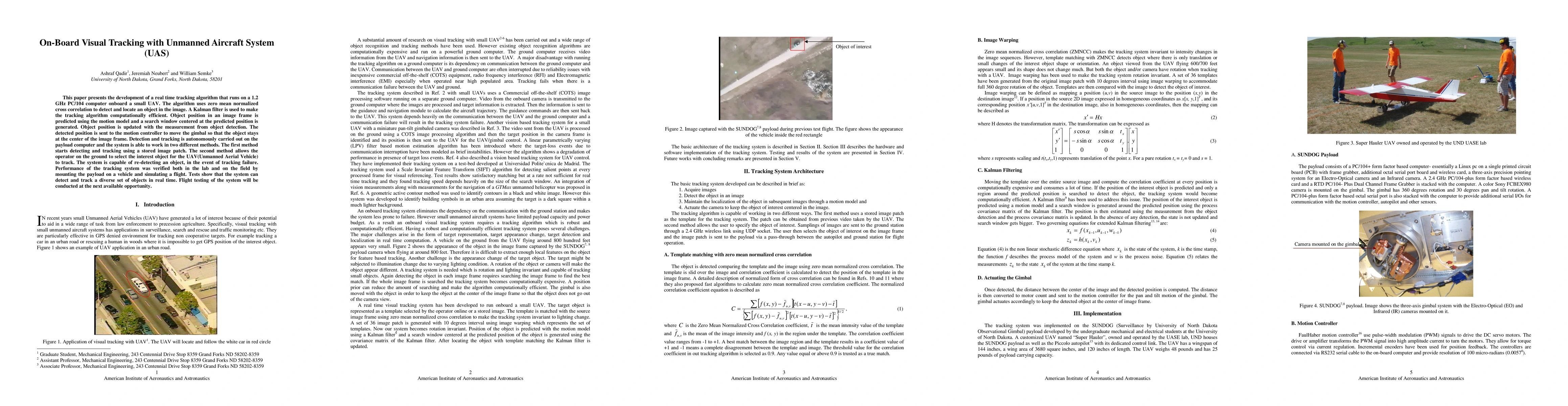 This paper presents the development of a real time tracking algorithm that runs on a 1.2 GHz PC/104 computer on-board a small UAV. The algorithm uses zero mean normalized cross correlation to detect and locate an object in the image. A kalman filter is used to make the tracking algorithm computationally efficient. Object position in an image frame is predicted using the motion model and a search window, centered at the predicted position is generated. Object position is updated with the measurement from object detection. The detected position is sent to the motion controller to move the gimbal so that the object stays at the center of the image frame. Detection and tracking is autonomously carried out on the payload computer and the system is able to work in two different methods. The first method starts detecting and tracking using a stored image patch. The second method allows the operator on the ground to select the interest object for the UAV to track. The system is capable of re-detecting an object, in the event of tracking failure. Performance of the tracking system was verified both in the lab and on the field by mounting the payload on a vehicle and simulating a flight. Tests show that the system can detect and track a diverse set of objects in real time. Flight testing of the system will be conducted at the next available opportunity.