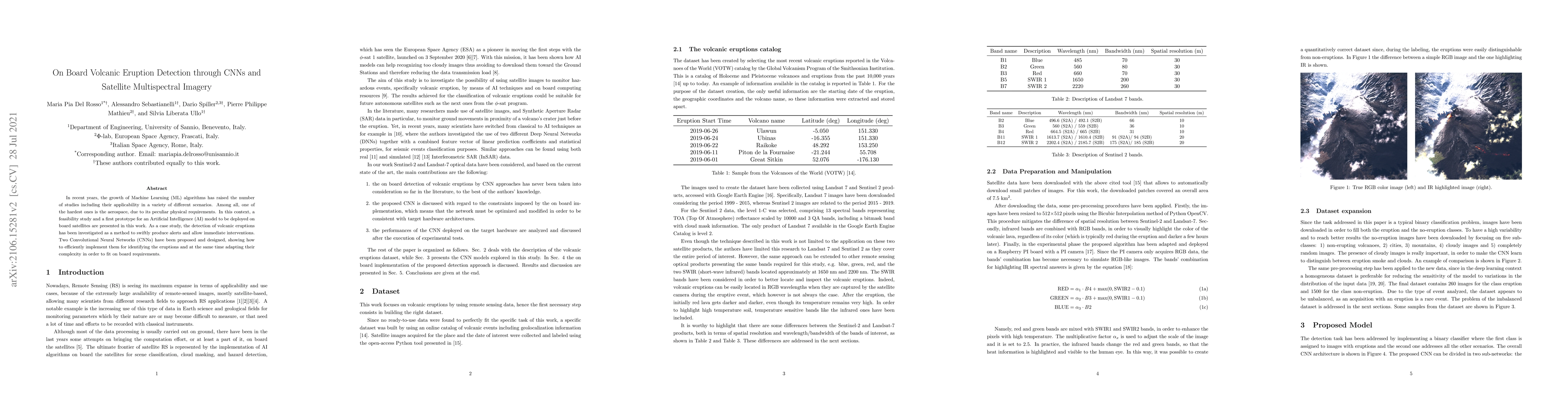 In recent years, the growth of Machine Learning (ML) algorithms has raised the number of studies including their applicability in a variety of different scenarios. Among all, one of the hardest ones is the aerospace, due to its peculiar physical requirements. In this context, a feasibility study and a first prototype for an Artificial Intelligence (AI) model to be deployed on board satellites are presented in this work. As a case study, the detection of volcanic eruptions has been investigated as a method to swiftly produce alerts and allow immediate interventions. Two Convolutional Neural Networks (CNNs) have been proposed and designed, showing how to efficiently implement them for identifying the eruptions and at the same time adapting their complexity in order to fit on board requirements.