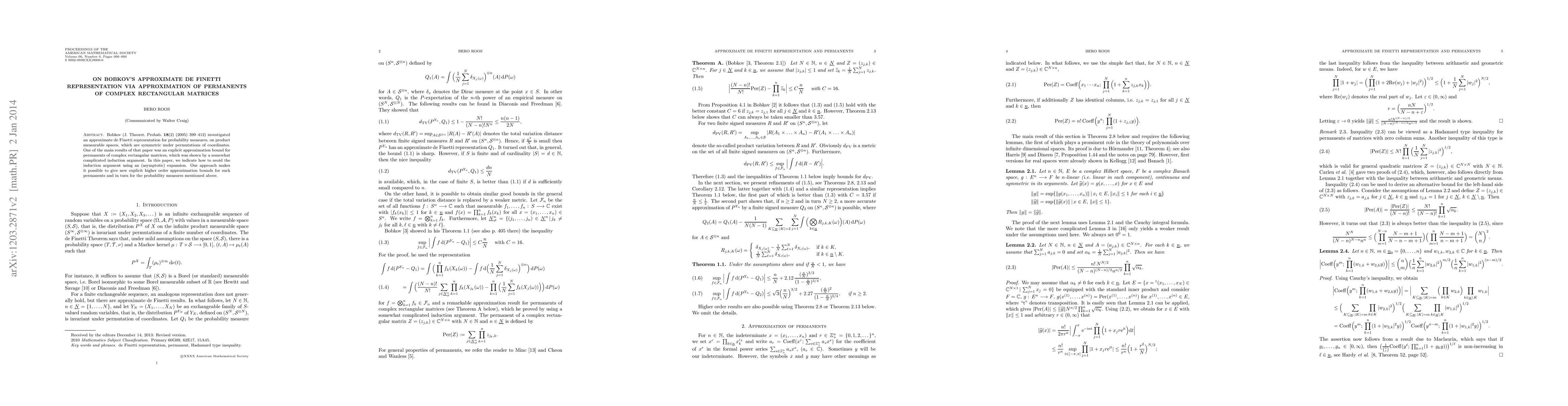 Bobkov (J. Theoret. Probab. 18(2) (2005) 399-412) investigated an approximate de Finetti representation for probability measures, on product measurable spaces, which are symmetric under permutations of coordinates. One of the main results of that paper was an explicit approximation bound for permanents of complex rectangular matrices, which was shown by a somewhat complicated induction argument. In this paper, we indicate how to avoid the induction argument using an (asymptotic) expansion. Our approach makes it possible to give new explicit higher order approximation bounds for such permanents and in turn for the probability measures mentioned above.