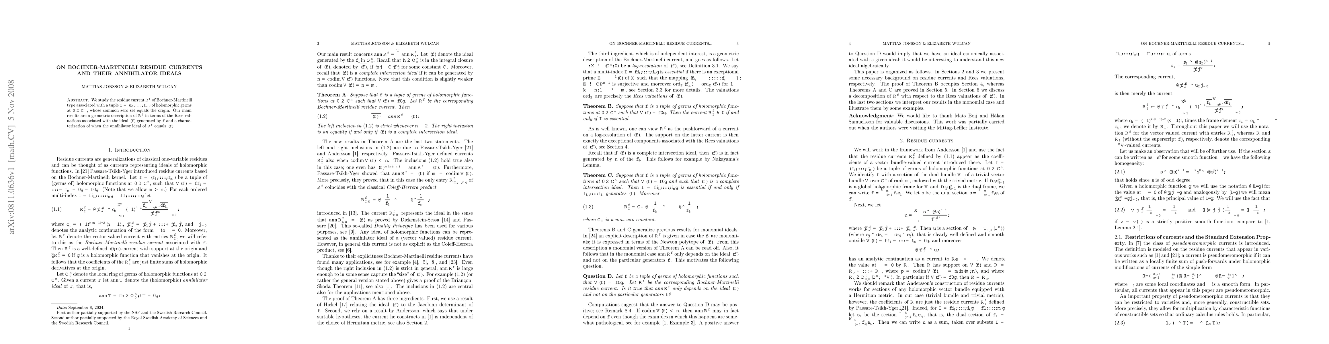 This paper investigates Bochner-Martinelli residue currents associated with holomorphic germs vanishing at the origin in complex spaces, providing a geometric description of these currents in terms of Rees valuations and characterizing when their annihilator ideals coincide with the ideal generated by the germs.