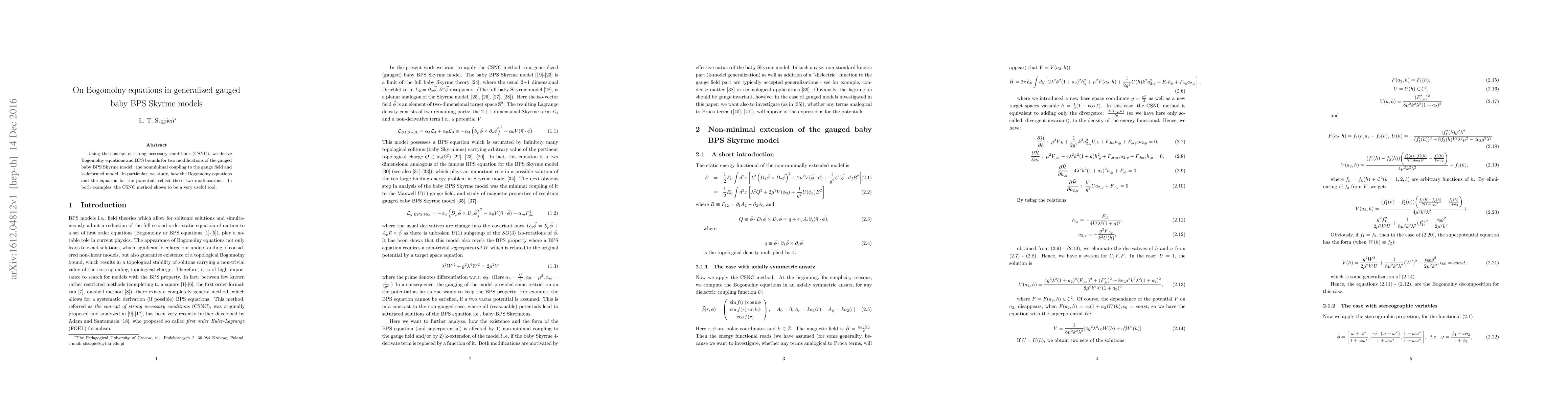 Using the concept of strong necessary conditions (CSNC), we derive Bogomolny equations and BPS bounds for two modifications of the gauged baby BPS Skyrme model: the nonminimal coupling to the gauge field and k-deformed model. In particular, we study, how the Bogomolny equations and the equation for the potential, reflect these two modifications. In both examples, the CSNC method shows to be a very useful tool.