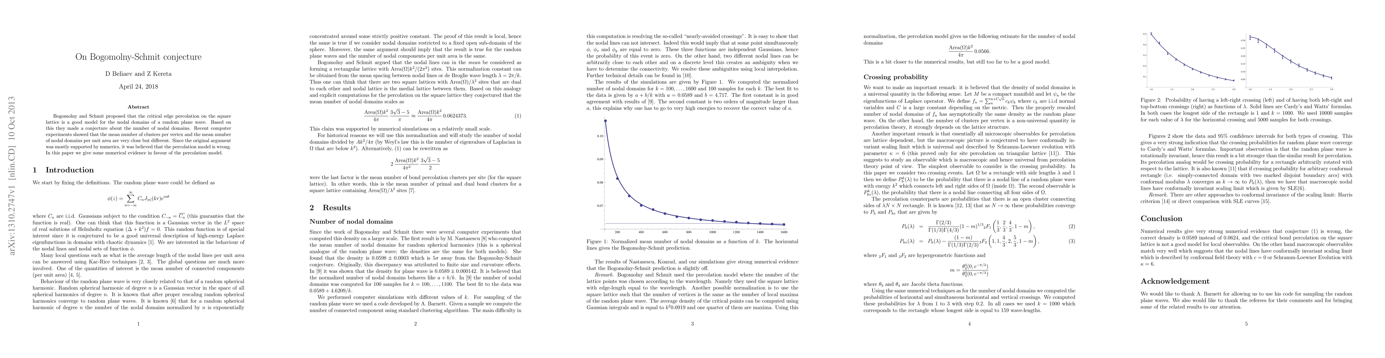 Bogomolny and Schmit proposed that the critical edge percolation on the square lattice is a good model for the nodal domains of a random plane wave. Based on this they made a conjecture about the number of nodal domains. Recent computer experiments showed that the mean number of clusters per vertex and the mean number of nodal domains per unit area are very close but different. Since the original argument was mostly supported by numerics, it was believed that the percolation model is wrong. In this paper we give some numerical evidence in favour of the percolation model.