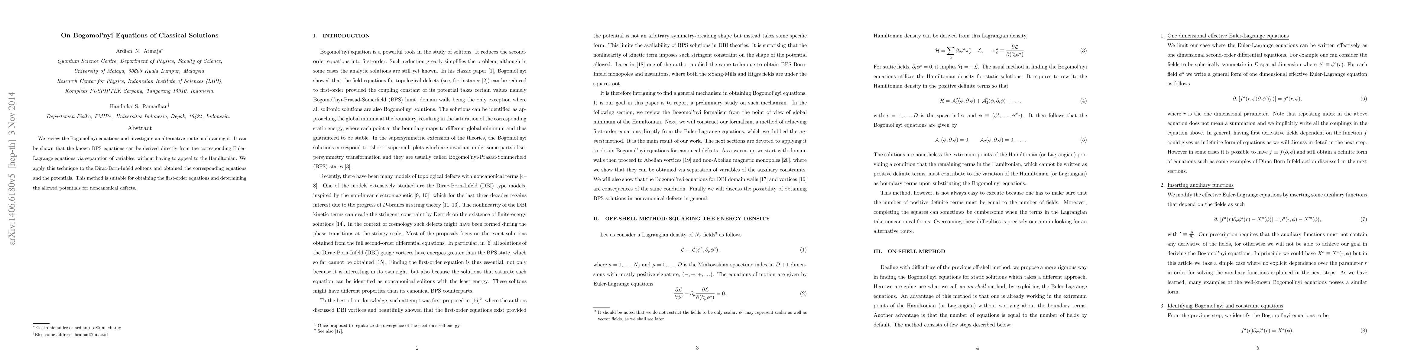 Summary: This paper reviews the Bogomol'nyi equations and presents an alternative derivation method using Euler-Lagrange equations and separation of variables, applied to Dirac-Born-Infeld solitons to obtain first-order equations and potentials for noncanonical defects.