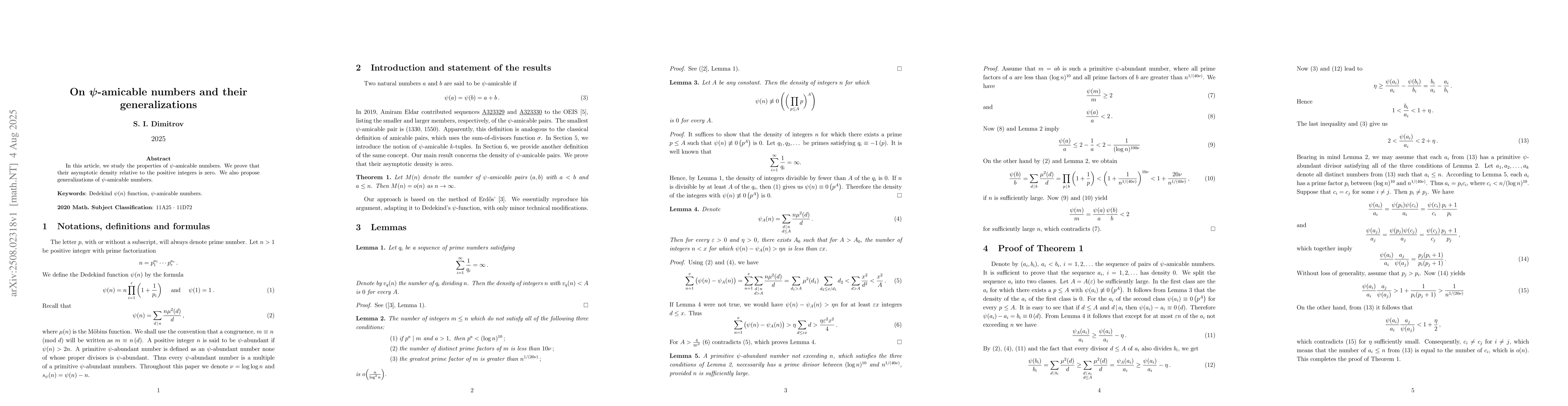 In this article, we study the properties of $\psi$-amicable numbers. We prove that their asymptotic density relative to the positive integers is zero. We also propose generalizations of $\psi$-amicable numbers.