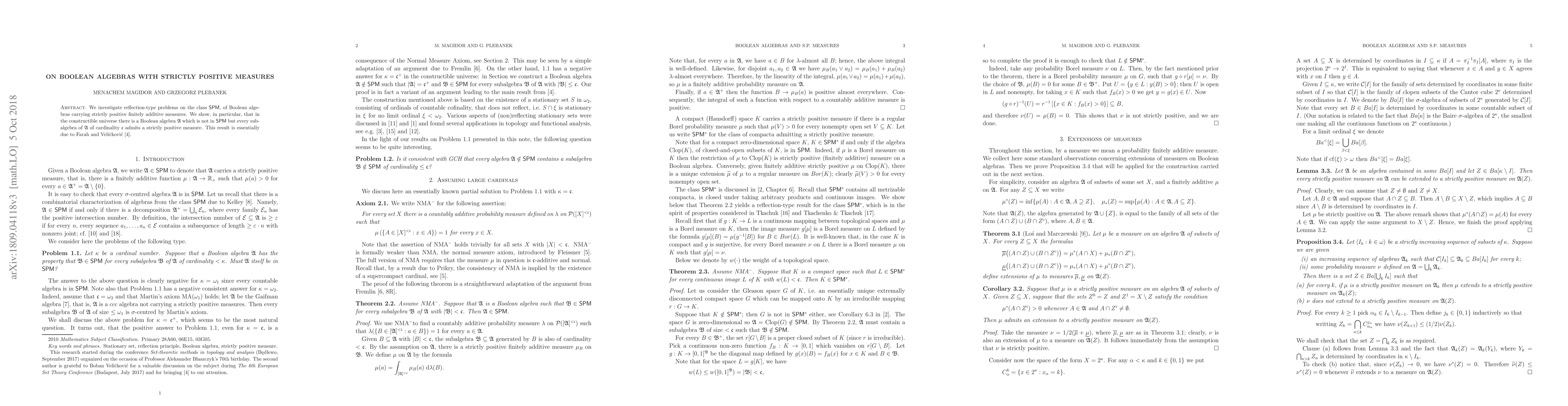 This paper explores reflection-type problems in Boolean algebras with strictly positive measures, demonstrating that in the constructible universe, there exists a Boolean algebra not in SPM where every subalgebra of cardinality $\mathfrak c$ can still support such measures. This finding is attributed to Farah and Velickovic.
