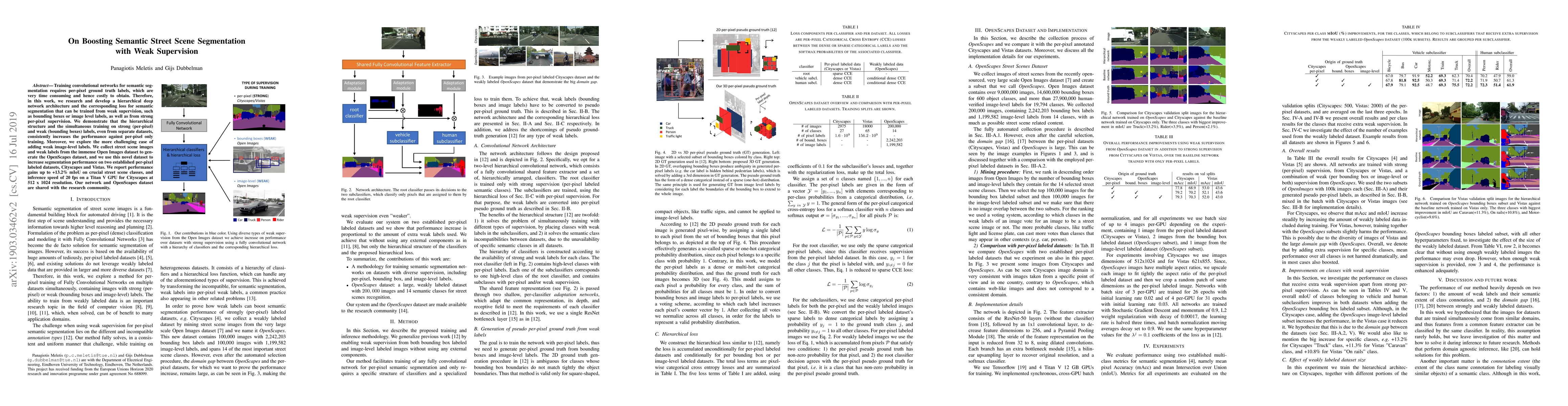 Training convolutional networks for semantic segmentation requires per-pixel ground truth labels, which are very time consuming and hence costly to obtain. Therefore, in this work, we research and develop a hierarchical deep network architecture and the corresponding loss for semantic segmentation that can be trained from weak supervision, such as bounding boxes or image level labels, as well as from strong per-pixel supervision. We demonstrate that the hierarchical structure and the simultaneous training on strong (per-pixel) and weak (bounding boxes) labels, even from separate datasets, constantly increases the performance against per-pixel only training. Moreover, we explore the more challenging case of adding weak image-level labels. We collect street scene images and weak labels from the immense Open Images dataset to generate the OpenScapes dataset, and we use this novel dataset to increase segmentation performance on two established per-pixel labeled datasets, Cityscapes and Vistas. We report performance gains up to +13.2% mIoU on crucial street scene classes, and inference speed of 20 fps on a Titan V GPU for Cityscapes at 512 x 1024 resolution. Our network and OpenScapes dataset are shared with the research community.