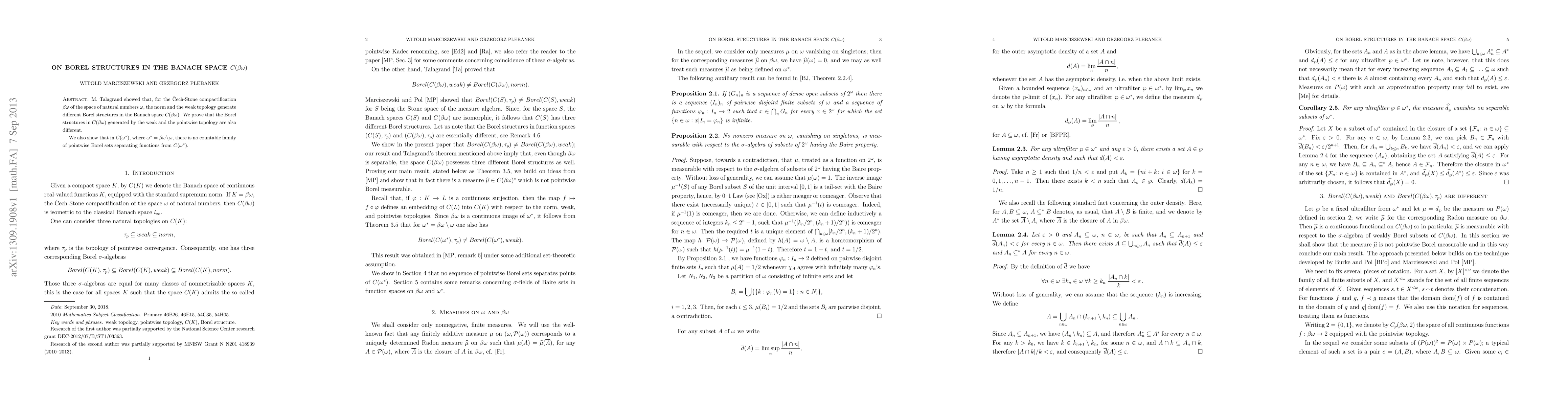 Summary: M. Talagrand demonstrated that the norm and weak topology generate distinct Borel structures in the Banach space C(\beta\omega). This paper further proves that the Borel structures from the weak and pointwise topologies in C(\beta\omega) differ. Additionally, it shows that C(\omega*), the space of functions on the remainder of \beta\omega after removing natural numbers, lacks a countable family of pointwise Borel sets that can distinguish functions within it.