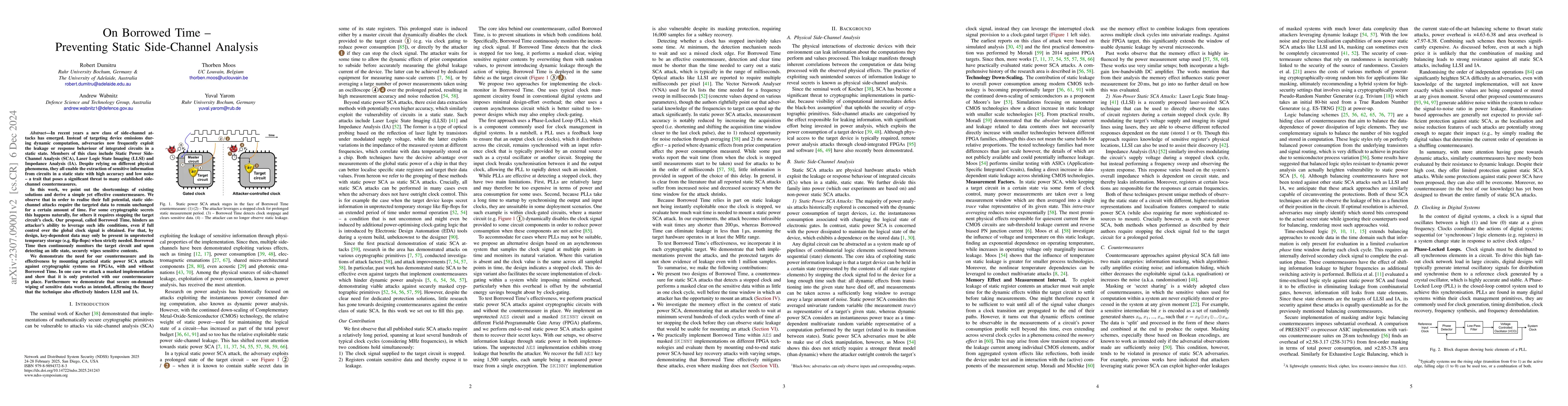 This paper addresses the threat of static power side-channel analysis attacks in cryptographic implementations, proposing a countermeasure named Borrowed Time that detects clock stops and resets registers to prevent leakage of sensitive information. The effectiveness of the countermeasure is demonstrated by successfully preventing key recovery in an AES implementation on an FPGA.
