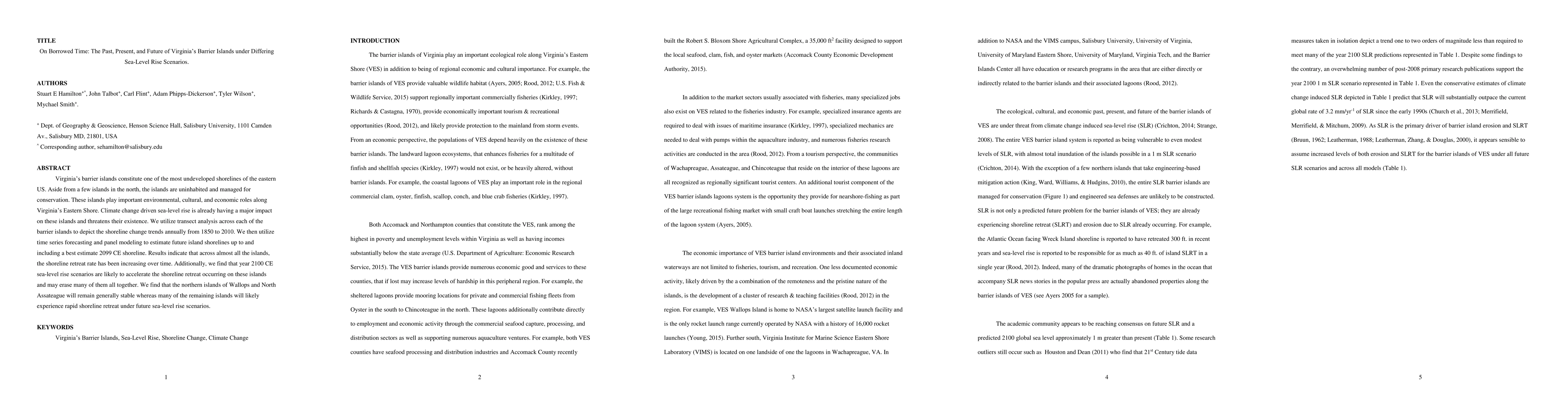 This study examines Virginia's barrier islands' shoreline changes from 1850 to 2010 and predicts future impacts under various sea-level rise scenarios. Results show increasing shoreline retreat rates and suggest that many islands will likely disappear by 2100, except for the northern islands which are expected to remain stable.