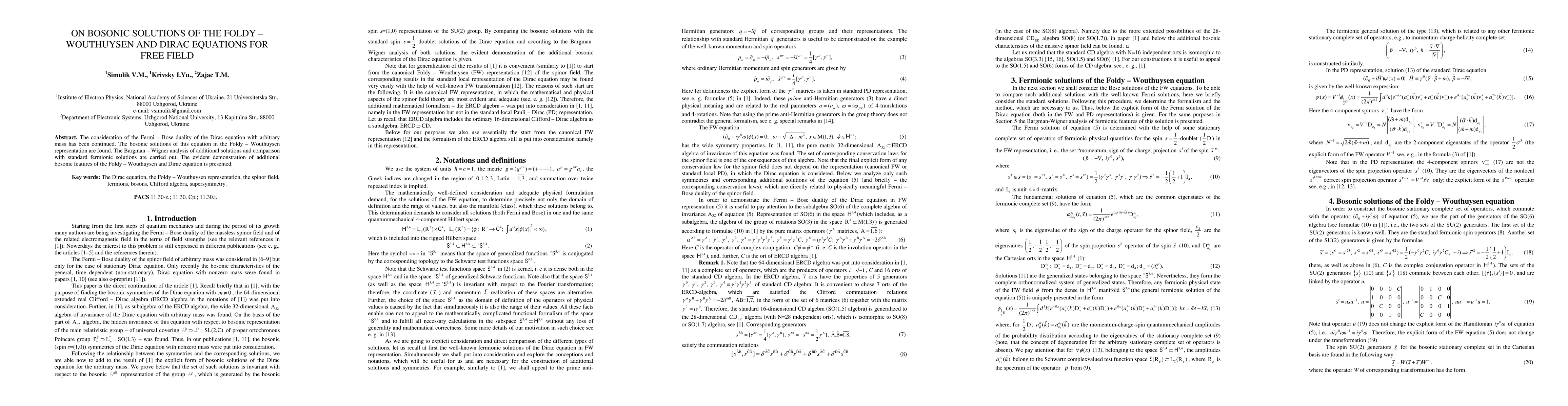 The consideration of the Fermi - Bose duality of the Dirac equation with arbitrary mass has been continued. The bosonic solutions of this equation in the Foldy - Wouthuysen representation are found. The Bargman - Wigner analysis of additional solutions and comparison with standard fermionic solutions are carried out. The evident demonstration of additional bosonic features of the Foldy - Wouthuysen and Dirac equation is presented.