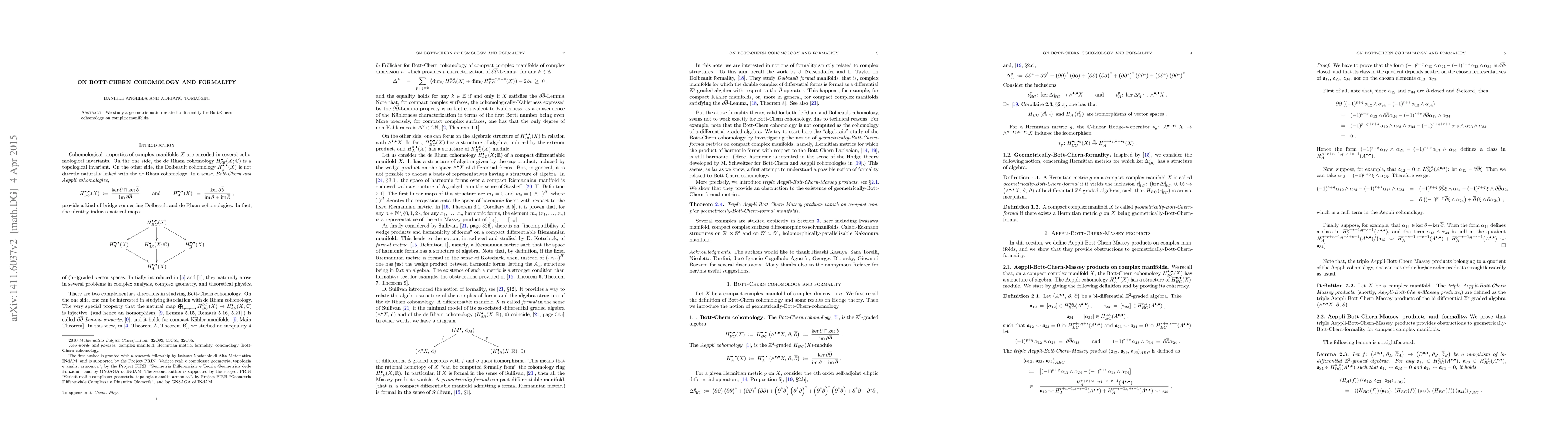 Two-line summary: This paper explores the connection between formality and Bott-Chern cohomology on complex manifolds, introducing a geometric perspective to understand the relationship between these two important concepts in differential geometry and algebraic topology. The study aims to deepen the understanding of the formal structure inherent in Bott-Chern cohomology.