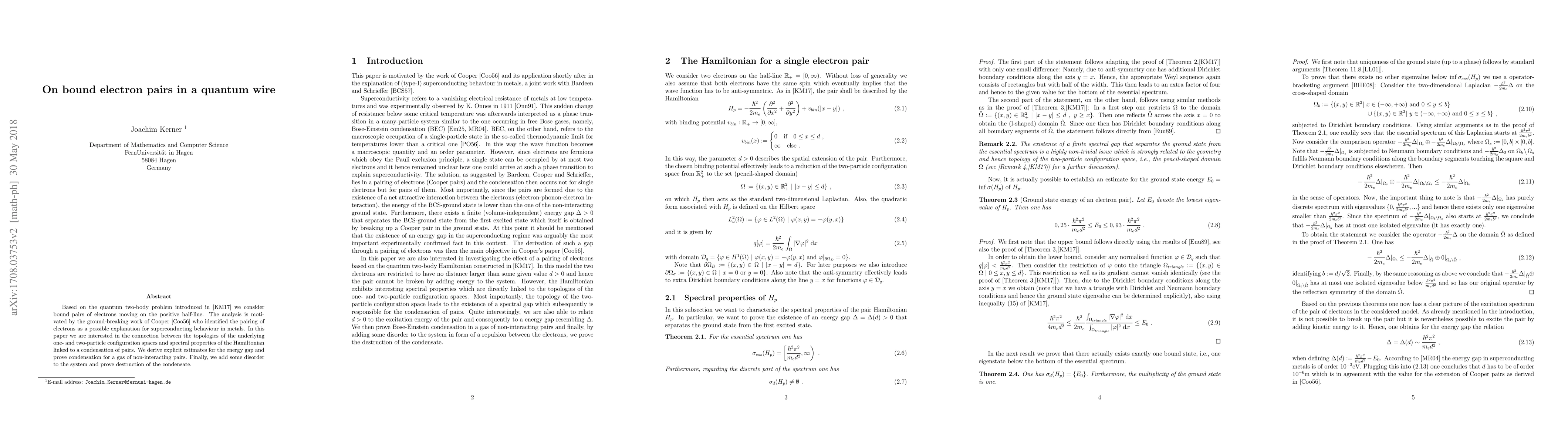 Based on the quantum two-body problem introduced in [arXiv:1604.06693] we consider bound pairs of electrons moving on the positive half-line. The analysis is motivated by the ground-breaking work of Cooper who identified the pairing of electrons as a possible explanation for superconducting behaviour in metals. In this paper we are interested in the connection between the topologies of the underlying one- and two-particle configuration spaces and spectral properties of the Hamiltonian linked to a condensation of pairs. We derive explicit estimates for the energy gap and prove condensation for a gas of non-interacting pairs. Finally, we add some disorder to the system and prove destruction of the condensate.