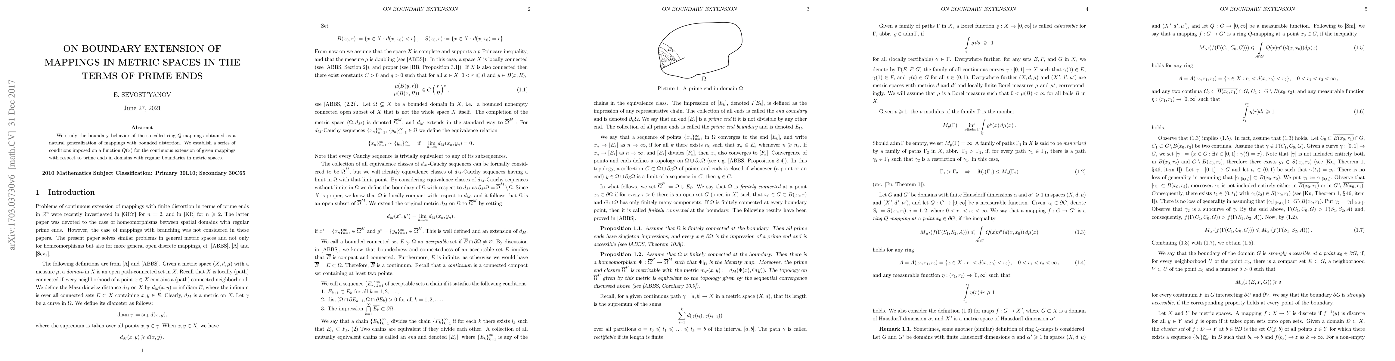 This paper investigates the boundary extension of ring $Q$-mappings in metric spaces, focusing on conditions for continuous extension concerning prime ends in domains with regular boundaries. It establishes criteria for the extension based on the properties of the function $Q(x)$.