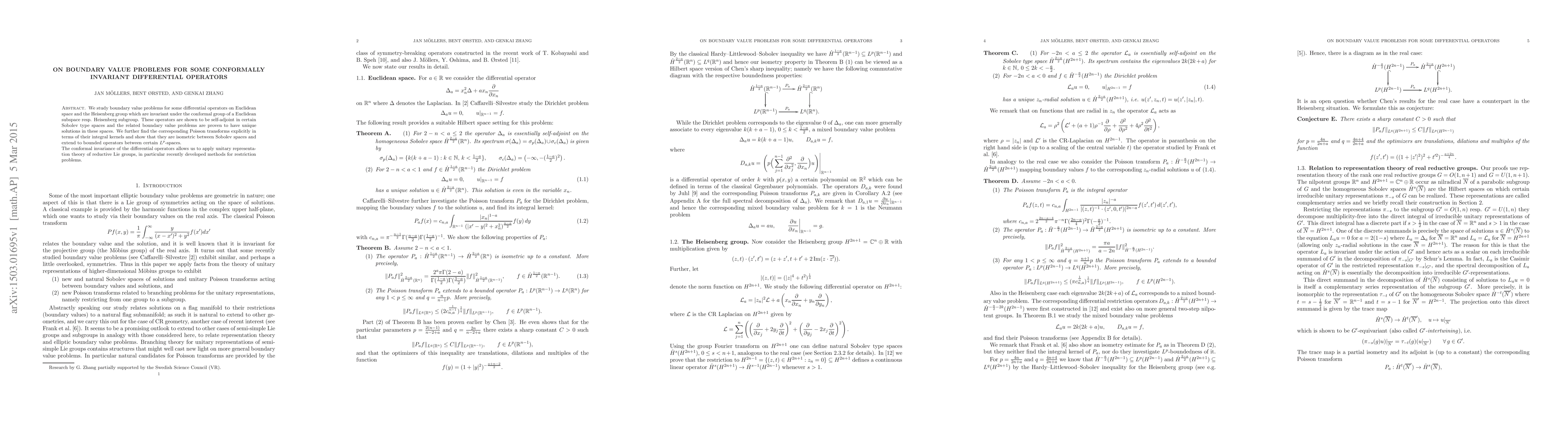 We study boundary value problems for some differential operators on Euclidean space and the Heisenberg group which are invariant under the conformal group of a Euclidean subspace resp. Heisenberg subgroup. These operators are shown to be self-adjoint in certain Sobolev type spaces and the related boundary value problems are proven to have unique solutions in these spaces. We further find the corresponding Poisson transforms explicitly in terms of their integral kernels and show that they are isometric between Sobolev spaces and extend to bounded operators between certain $L^p$-spaces. The conformal invariance of the differential operators allows us to apply unitary representation theory of reductive Lie groups, in particular recently developed methods for restriction problems.