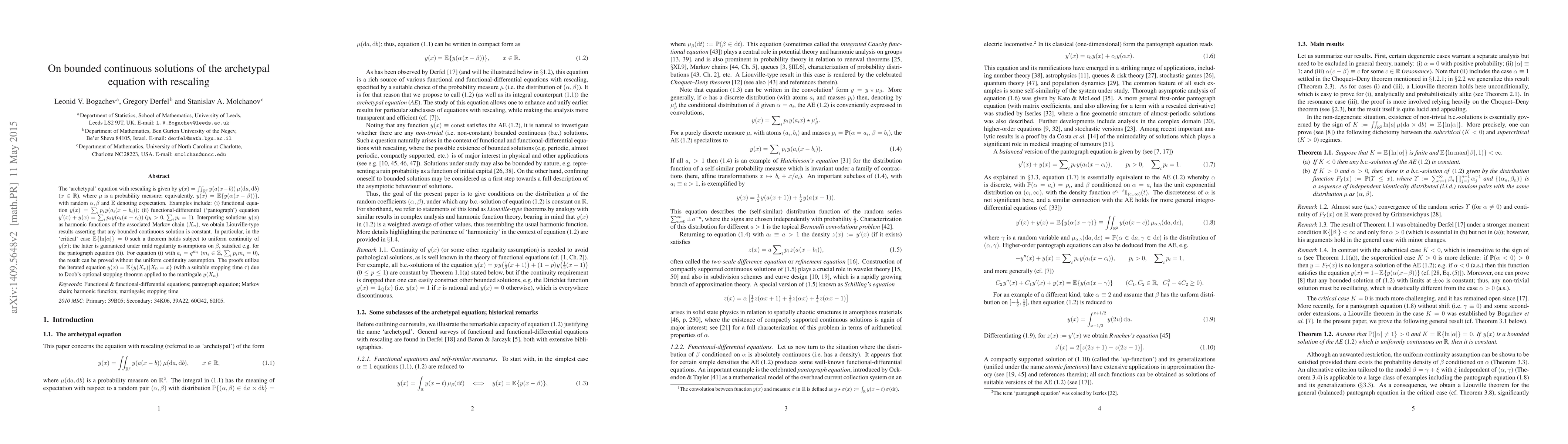 The `archetypal' equation with rescaling is given by $y(x)=\iint_{\mathbb{R}^2} y(a(x-b))\,\mu(\mathrm{d}a,\mathrm{d}b)$ ($x\in\mathbb{R}$), where $\mu$ is a probability measure; equivalently, $y(x)=\mathbb{E}\{y(\alpha(x-\beta))\}$, with random $\alpha,\beta$ and $\mathbb{E}$ denoting expectation. Examples include: (i) functional equation $y(x)=\sum_{i} p_{i} y(a_i(x-b_i))$; (ii) functional-differential (`pantograph') equation $y'(x)+y(x)=\sum_{i} p_{i} y(a_i(x-c_i))$ ($p_{i}>0$, $\sum_{i} p_{i}=1$). Interpreting solutions $y(x)$ as harmonic functions of the associated Markov chain $(X_n)$, we obtain Liouville-type results asserting that any bounded continuous solution is constant. In particular, in the `critical' case $\mathbb{E}\{\ln|\alpha|\}=0$ such a theorem holds subject to uniform continuity of $y(x)$; the latter is guaranteed under mild regularity assumptions on $\beta$, satisfied e.g.\ for the pantograph equation (ii). For equation (i) with $a_i=q^{m_i}$ ($m_i\in\mathbb{Z}$, $\sum_i p_i m_i=0$), the result can be proved without the uniform continuity assumption. The proofs utilize the iterated equation $y(x)=\mathbb{E}\{y(X_\tau)\,|\,X_0=x\}$ (with a suitable stopping time $\tau$) due to Doob's optional stopping theorem applied to the martingale $y(X_n)$.