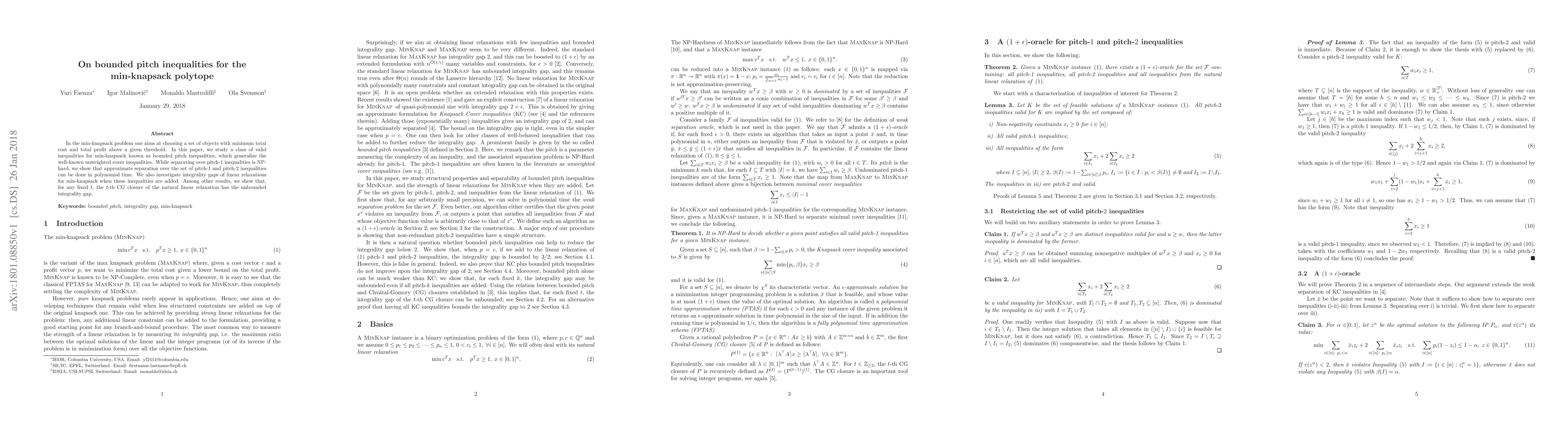 In the min-knapsack problem one aims at choosing a set of objects with minimum total cost and total profit above a given threshold. In this paper, we study a class of valid inequalities for min-knapsack known as bounded pitch inequalities, which generalize the well-known unweighted cover inequalities. While separating over pitch-1 inequalities is NP-hard, we show that approximate separation over the set of pitch-1 and pitch-2 inequalities can be done in polynomial time. We also investigate integrality gaps of linear relaxations for min-knapsack when these inequalities are added. Among other results, we show that, for any fixed $t$, the $t$-th CG closure of the natural linear relaxation has the unbounded integrality gap.