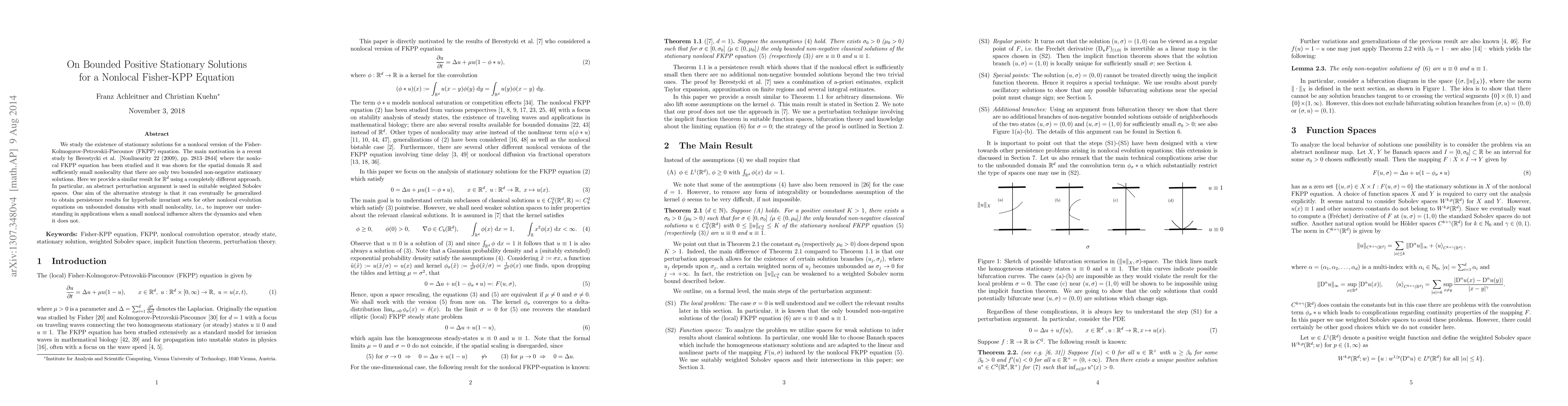 We study the existence of stationary solutions for a nonlocal version of the Fisher-Kolmogorov-Petrovskii-Piscounov (FKPP) equation. The main motivation is a recent study by Berestycki et {al.} [Nonlinearity 22 (2009), {pp.}~2813--2844] where the nonlocal FKPP equation has been studied and it was shown for the spatial domain $\mathbb{R}$ andsufficiently small nonlocality that there are only two bounded non-negative stationary solutions. Here we provide a similar result for $\mathbb{R}^d$ using a completely different approach. In particular, an abstract perturbation argument is used in suitable weighted Sobolev spaces. One aim of the alternative strategy is that it can eventually be generalized to obtain persistence results for hyperbolic invariant sets for other nonlocal evolution equations on unbounded domains with small nonlocality, {i.e.}, to improve our understanding in applications when a small nonlocal influence alters the dynamics and when it does not.