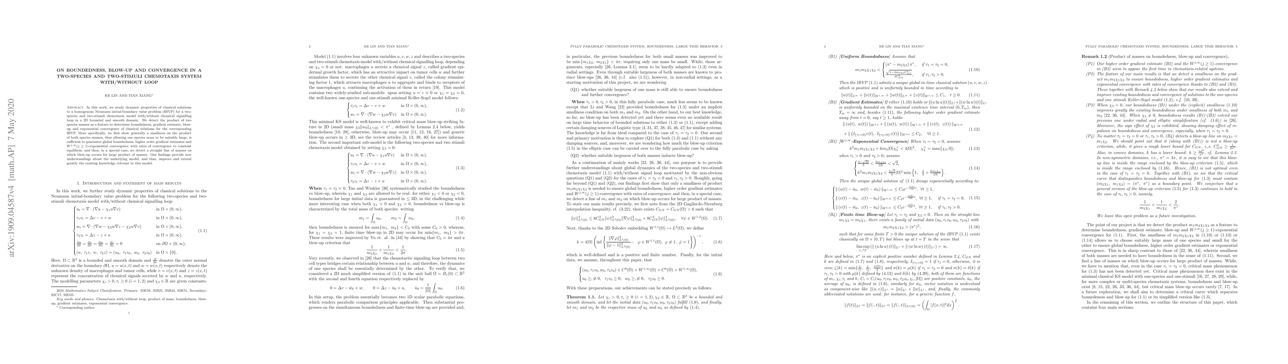 In this work, we study dynamic properties of classical solutions to a homogenous Neumann initial-boundary value problem (IBVP) for a two-species and two-stimuli chemotaxis model with/without chemical signalling loop in a 2D bounded and smooth domain. We successfully detect the product of two species masses as a feature to determine boundedness, gradient estimates, blow-up and $W^{j,\infty}(1\leq j\leq 3)$-exponential convergence of classical solutions for the corresponding IBVP. More specifically, we first show generally a smallness on the product of both species masses, thus allowing one species mass to be suitably large, is sufficient to guarantee global boundedness, higher order gradient estimates and $W^{j,\infty}$-convergence with rates of convergence to constant equilibria; and then, in a special case, we detect a straight line of masses on which blow-up occurs for large product of masses. Our findings provide new understandings about the underlying model, and thus, improve and extend greatly the existing knowledge relevant to this model.