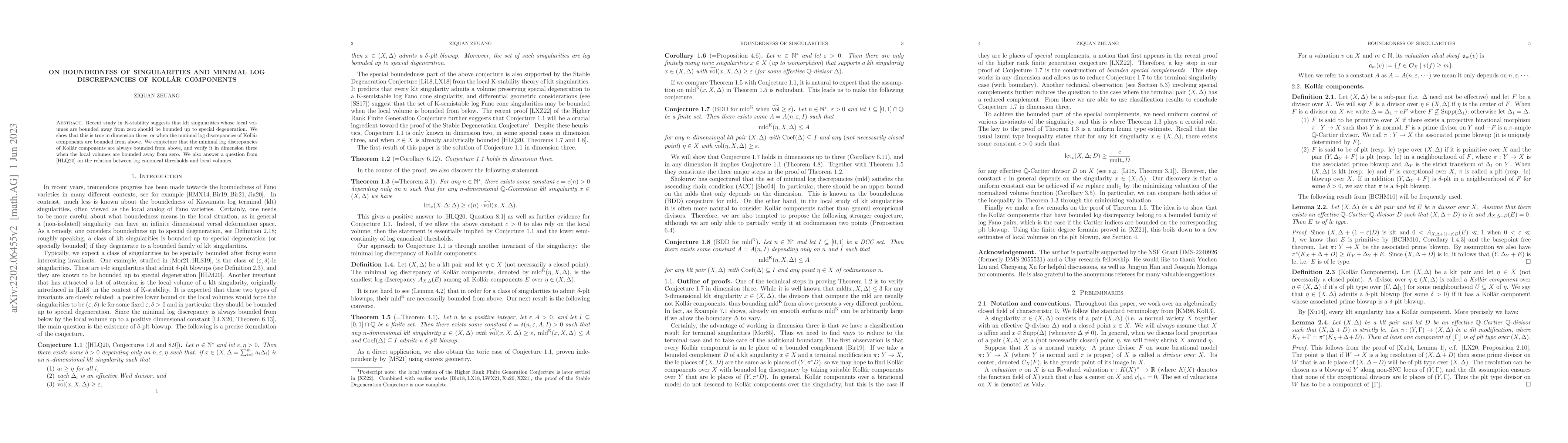 This paper demonstrates that in dimension three, klt singularities with bounded local volumes lead to bounded minimal log discrepancies of Kollár components. It verifies this conjecture in dimension three and addresses a question regarding the relationship between log canonical thresholds and local volumes.