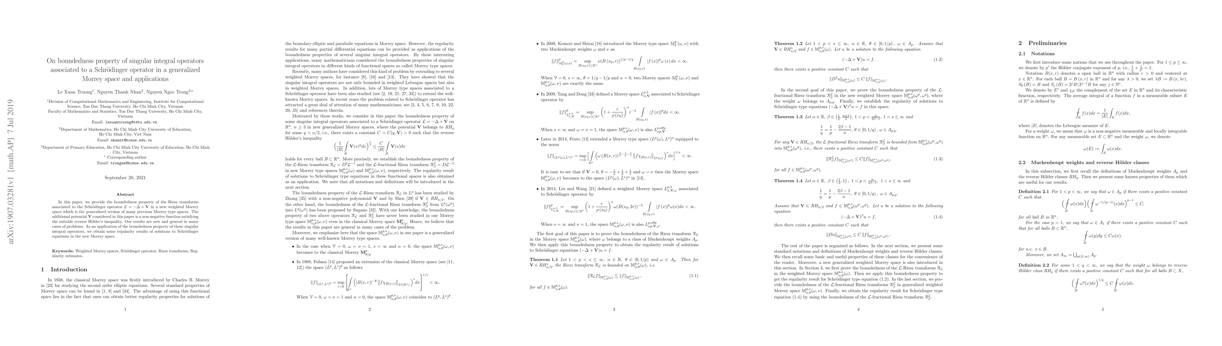 In this paper, we provide the boundedness property of the Riesz transforms associated to the Schr\"odinger operator $\mathcal{L}=-\Delta + \mathbf{V}$ in a new weighted Morrey space which is the generalized version of many previous Morrey type spaces. The additional potential $\V$ considered in this paper is a non-negative function satisfying the suitable reverse H\"older's inequality. Our results are new and general in many cases of problems. As an application of the boundedness property of these singular integral operators, we obtain some regularity results of solutions to Schr\"odinger equations in the new Morrey space.