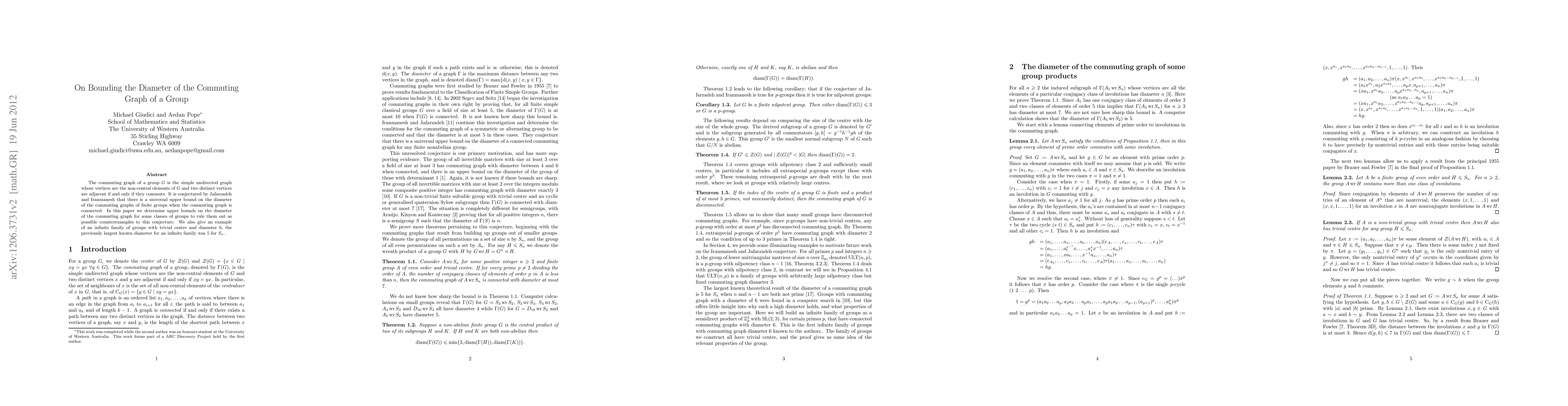 The paper presents a detailed analysis of the commuting graph's diameter for various group classes and provides a novel example of an infinite family of groups with a diameter of 6.