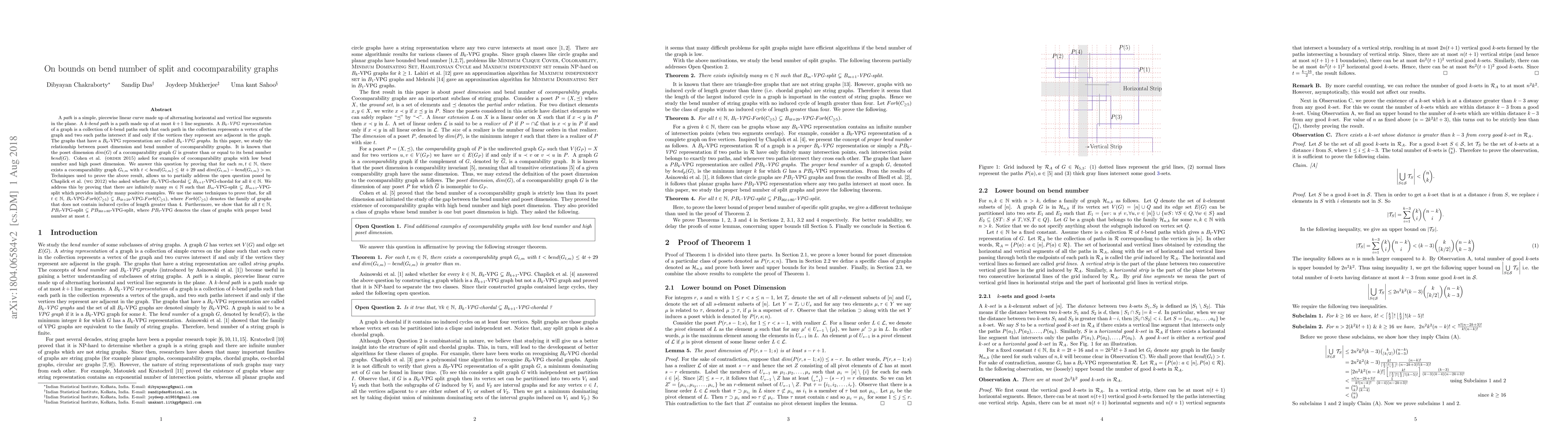 A path is a simple, piecewise linear curve made up of alternating horizontal and vertical line segments in the plane. A $k$-bend path is a path made up of at most $k + 1$ line segments. A $B_k$-VPG representation of a graph is a collection of $k$-bend paths such that each path in the collection represents a vertex of the graph and two such paths intersect if and only if the vertices they represent are adjacent in the graph. The graphs that have a $B_k$-VPG representation are called $B_k$-VPG graphs. It is known that the poset dimension $dim(G)$ of a cocomparability graph $G$ is greater than or equal to its bend number $bend(G)$. Cohen et al. ({\textsc{order 2015}}) asked for examples of cocomparability graphs with low bend number and high poset dimension. We answer this question by proving that for each $m, t \in \mathbb{N}$, there exists a cocomparability graph $G_{t,m}$ with $t < bend(G_{t,m}) \leq 4t+29$ and $dim(G_{t,m})-bend(G_{t,m})>m$. Techniques used to prove the above result, allows us to partially address the open question posed by Chaplick et al. ({\textsc{wg 2012}}) who asked whether $B_k$-VPG-chordal $\subsetneq$ $B_{k+1}$-VPG-chordal for all $k \in \mathbb{N}$. We address this by proving that there are infinitely many $m \in \mathbb{N}$ such that $B_m$-VPG-split $\subsetneq$ $B_{m+1}$-VPG-split which provides infinitely many positive examples. We use the same techniques to prove that, for all $t \in \mathbb{N}$, $B_t$-VPG-$Forb(C_{\geq 5})$ $\subsetneq$ $B_{4t+29}$-VPG-$Forb(C_{\geq 5})$, where $Forb(C_{\geq 5})$ denotes the family of graphs that does not contain induced cycles of length greater than 4. Furthermore, we show that for all $t \in \mathbb{N}$, $PB_t$-VPG-split $\subsetneq PB_{36t+80}$-VPG-split, where $PB_t$-VPG denotes the class of graphs with proper bend number at most $t$.