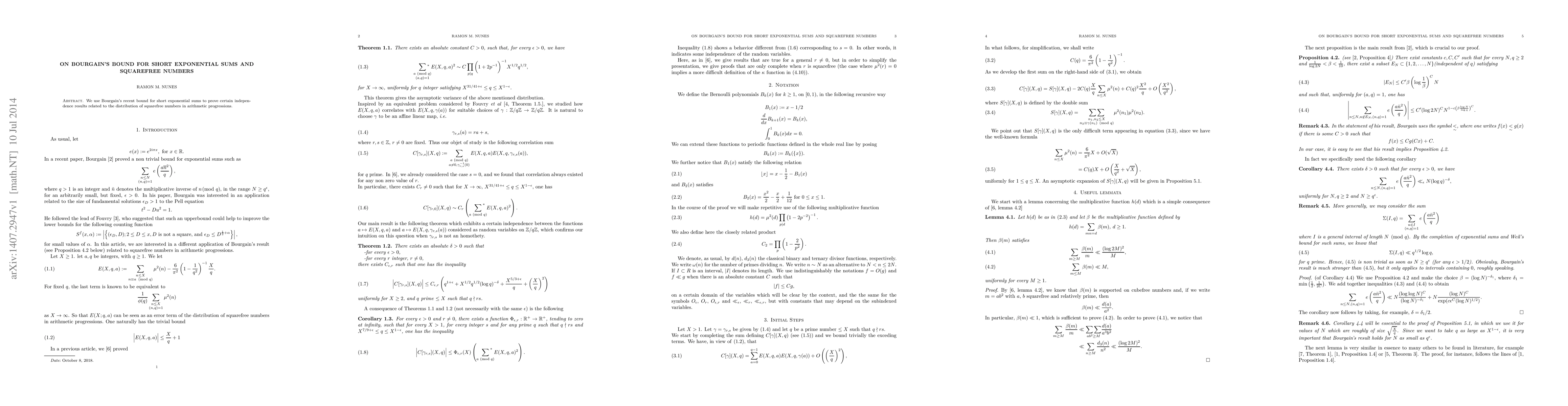We use Bourgain's recent bound for short exponential sums to prove certain independence results related to the distribution of squarefree numbers in arithmetic progressions.