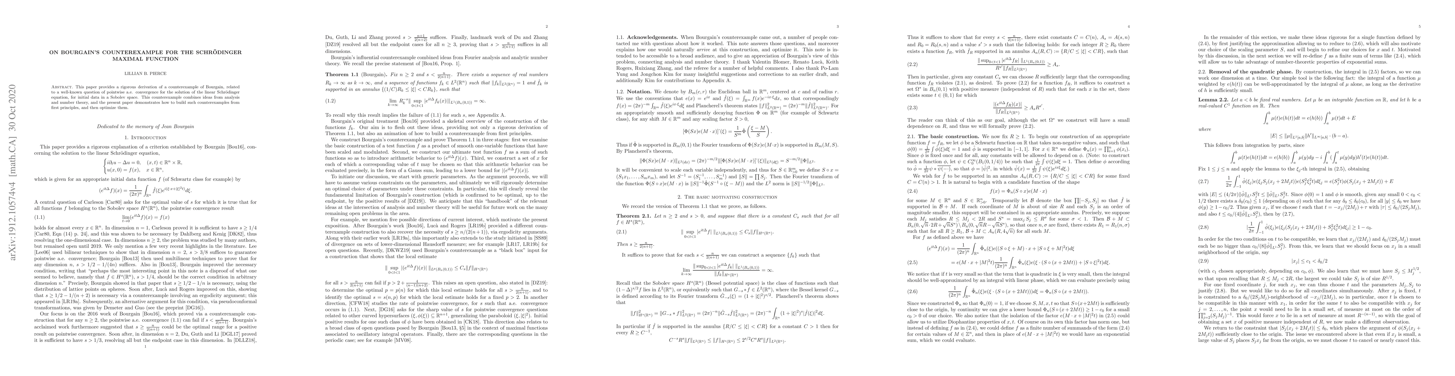 This paper provides a rigorous derivation of a counterexample of Bourgain, related to a well-known question of pointwise a.e. convergence for the solution of the linear Schr\"odinger equation, for initial data in a Sobolev space. This counterexample combines ideas from analysis and number theory, and the present paper demonstrates how to build such counterexamples from first principles, and then optimize them.