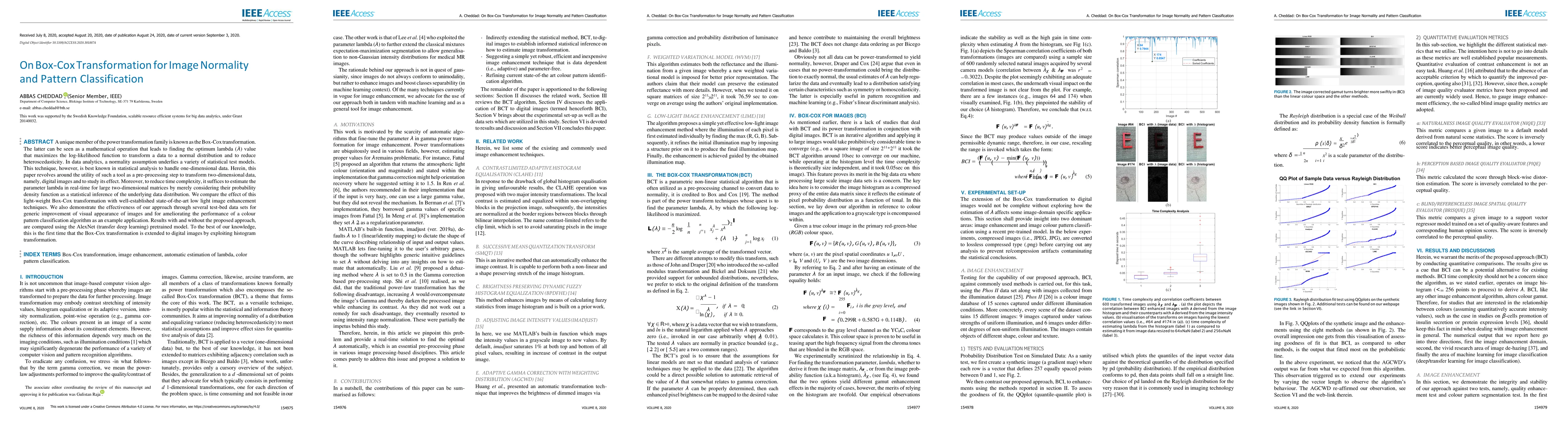 This paper explores the application of the Box-Cox transformation, traditionally used for one-dimensional data, to two-dimensional digital images to enhance their normality and improve pattern classification. The authors demonstrate its effectiveness in real-time estimation of the lambda parameter and compare it to state-of-the-art low light image enhancement techniques, showing improved visual appearance and classification performance using a pretrained AlexNet model.