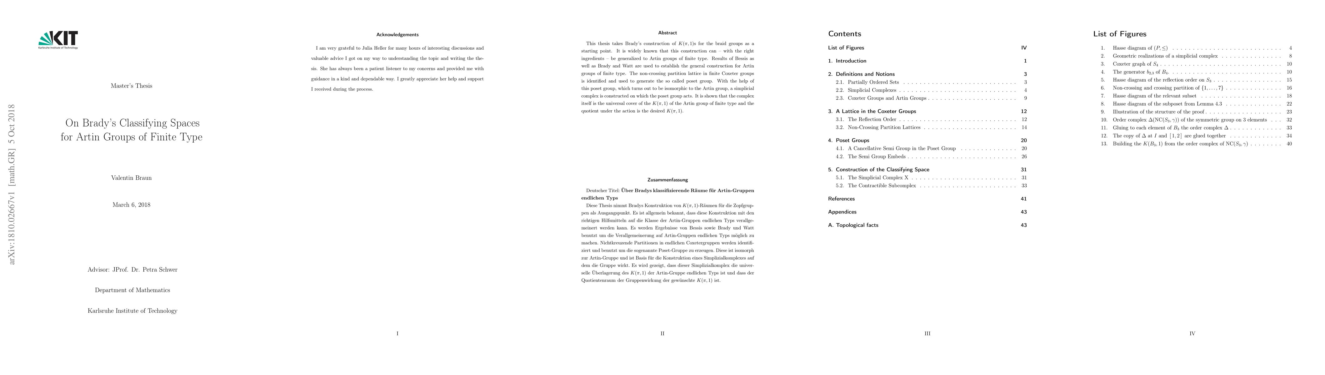 This thesis takes Brady's construction of $K(\pi,1)$s for the braid groups as a starting point. It is widely known that this construction can - with the right ingredients - be generalized to Artin groups of finite type. Results of Bessis as well as Brady and Watt are used to establish the general construction for Artin groups of finite type. The non-crossing partition lattice in finite Coxeter groups is identified and used to generate the so called poset group. With the help of this poset group, which turns out to be isomorphic to the Artin group, a simplicial complex is constructed on which the poset group acts. It is shown that the complex itself is the universal cover of the $K(\pi,1)$ of the Artin group of finite type and the quotient under the action is the desired $K(\pi,1)$.