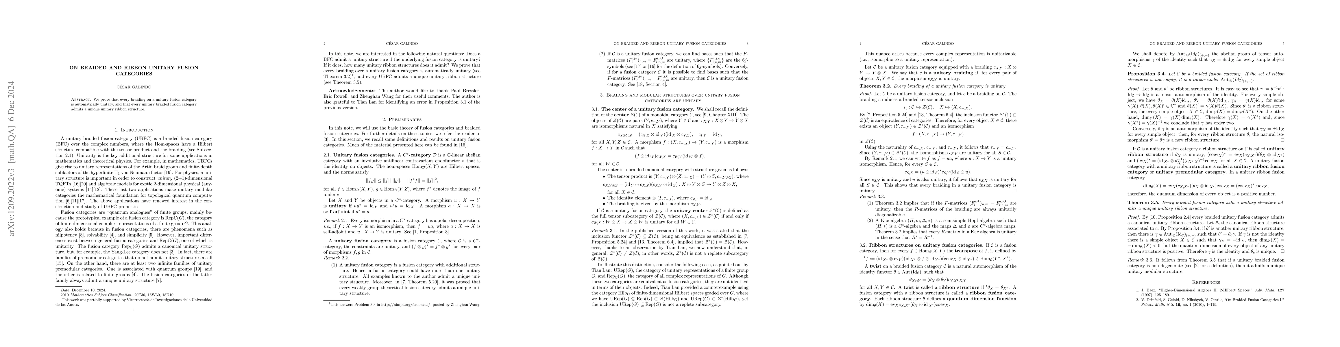 We prove that every braiding over a unitary fusion category is unitary and every unitary braided fusion category admits a unique unitary ribbon structure.