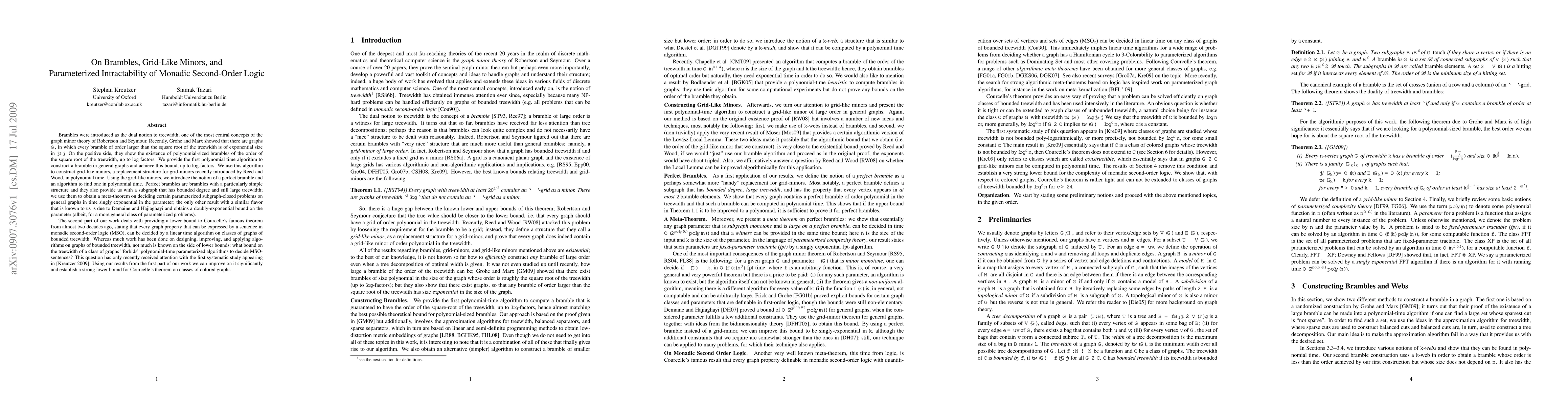 Brambles were introduced as the dual notion to treewidth, one of the most central concepts of the graph minor theory of Robertson and Seymour. Recently, Grohe and Marx showed that there are graphs G, in which every bramble of order larger than the square root of the treewidth is of exponential size in |G|. On the positive side, they show the existence of polynomial-sized brambles of the order of the square root of the treewidth, up to log factors. We provide the first polynomial time algorithm to construct a bramble in general graphs and achieve this bound, up to log-factors. We use this algorithm to construct grid-like minors, a replacement structure for grid-minors recently introduced by Reed and Wood, in polynomial time. Using the grid-like minors, we introduce the notion of a perfect bramble and an algorithm to find one in polynomial time. Perfect brambles are brambles with a particularly simple structure and they also provide us with a subgraph that has bounded degree and still large treewidth; we use them to obtain a meta-theorem on deciding certain parameterized subgraph-closed problems on general graphs in time singly exponential in the parameter. The second part of our work deals with providing a lower bound to Courcelle's famous theorem, stating that every graph property that can be expressed by a sentence in monadic second-order logic (MSO), can be decided by a linear time algorithm on classes of graphs of bounded treewidth. Using our results from the first part of our work we establish a strong lower bound for tractability of MSO on classes of colored graphs.