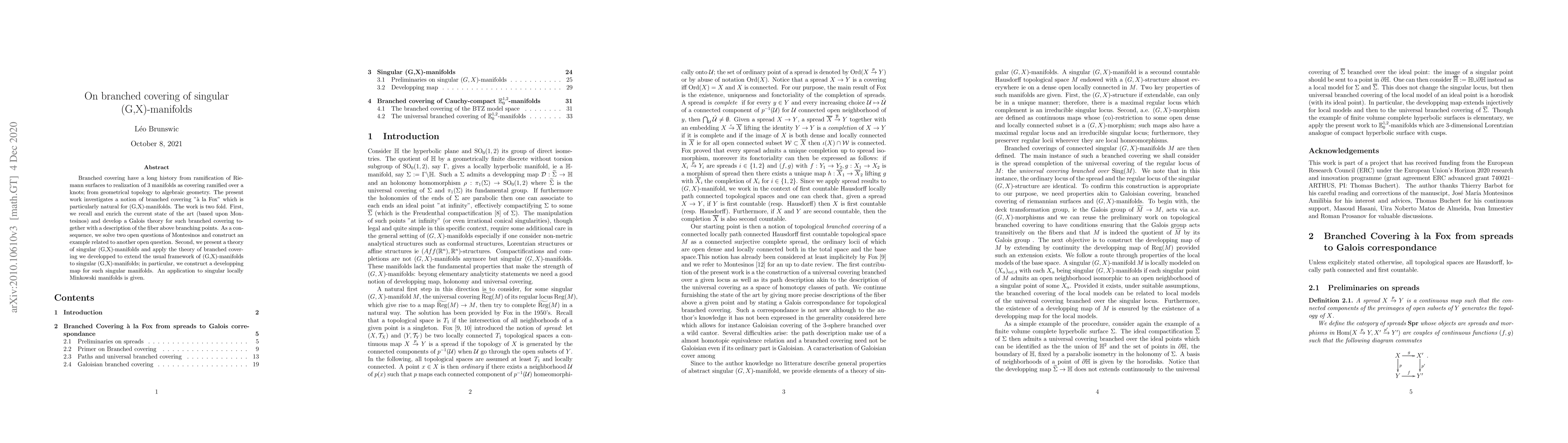 Branched covering have a long history from ramification of Riemann surfaces to realization of 3-manifolds as covering ramified over a knots; from geometrical topology to algebraic geometry. The present work investigates a notion of branched covering "\`a la Fox" which is particularly natural for (G,X)-manifolds. The work is two fold. First, we recall and enrich the current state of the art (based upon Montesinos) and develop a Galois theory for such branched covering together with a description of the fiber above branching points. As a consequence, we solve two open questions of Montesinos and construct an example related to another open question. Second, we present a theory of singular (G,X)-manifolds and apply the theory of branched covering we developped to extend the usual framework of (G,X)-manifolds to singular (G,X)-manifolds; in particular, we construct a developping map for such singular manifolds. An application to singular locally Minkowski manifolds is given.