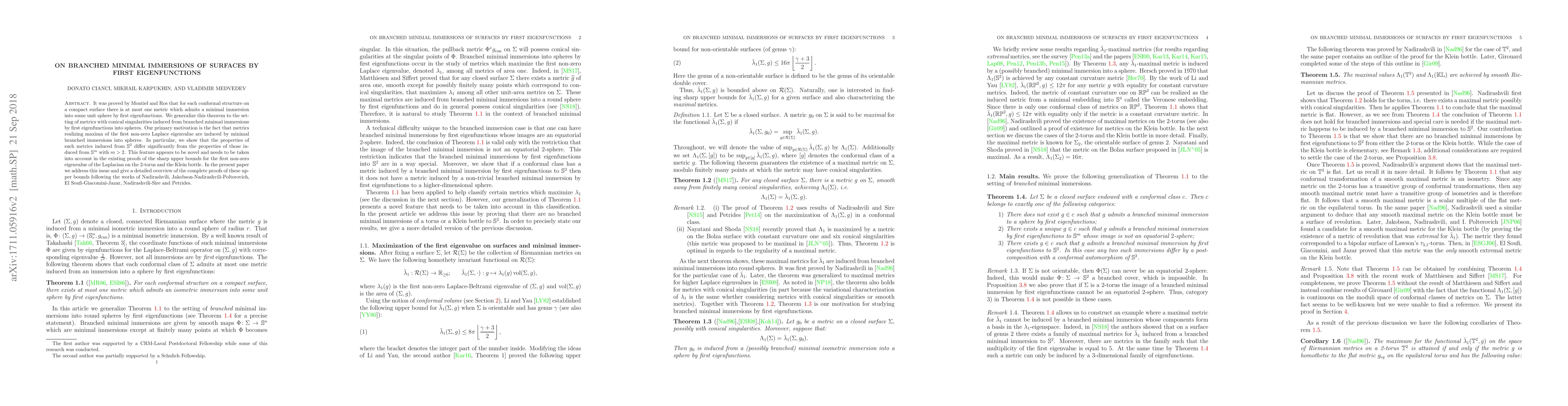 It was proved by Montiel and Ros that for each conformal structure on a compact surface there is at most one metric which admits a minimal immersion into some unit sphere by first eigenfunctions. We generalize this theorem to the setting of metrics with conical singularities induced from branched minimal immersions by first eigenfunctions into spheres. Our primary motivation is the fact that metrics realizing maxima of the first non-zero Laplace eigenvalue are induced by minimal branched immersions into spheres. In particular, we show that the properties of such metrics induced from $\mathbb{S}^2$ differ significantly from the properties of those induced from $\mathbb{S}^m$ with $m>2$. This feature appears to be novel and needs to be taken into account in the existing proofs of the sharp upper bounds for the first non-zero eigenvalue of the Laplacian on the $2$-torus and the Klein bottle. In the present paper we address this issue and give a detailed overview of the complete proofs of these upper bounds following the works of Nadirashvili, Jakobson-Nadirashvili-Polterovich, El Soufi-Giacomini-Jazar, Nadirashvili-Sire and Petrides.