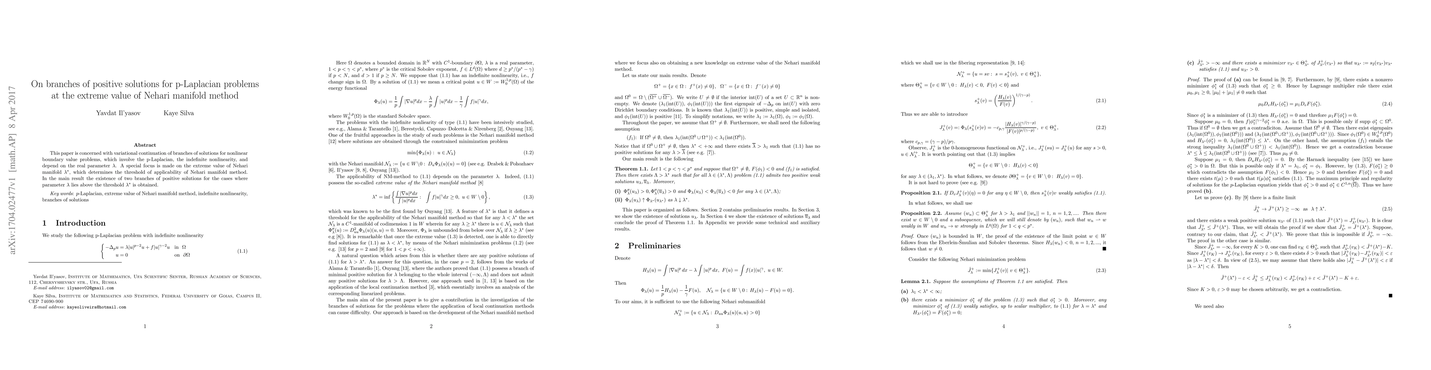 This paper is concerned with variational continuation of branches of solutions for nonlinear boundary value problems, which involve the p-Laplacian, the indefinite nonlinearity, and depend on the real parameter $\lambda$. A special focus is made on the extreme value of Nehari manifold $\lambda^*$, which determines the threshold of applicability of Nehari manifold method. In the main result the existence of two branches of positive solutions for the cases where parameter $\lambda$ lies above the threshold $\lambda^*$ is obtained.