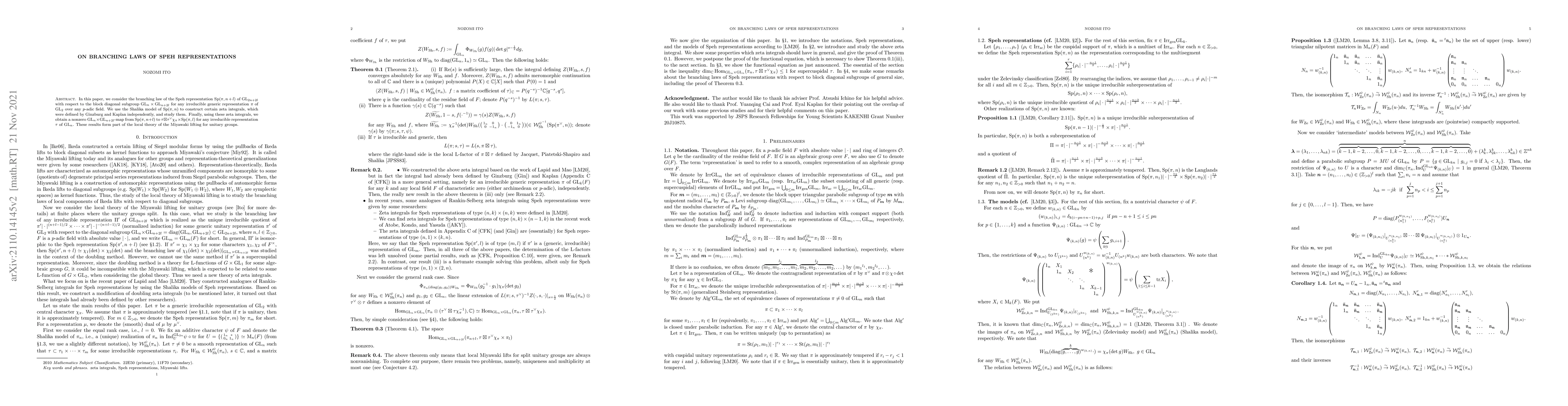 Researchers studied the branching law of Speh representations for GL_{2n+2l} with respect to a block diagonal subgroup, constructing zeta integrals and mapping them to other representations. The results contribute to the local theory of the Miyawaki lifting for unitary groups.