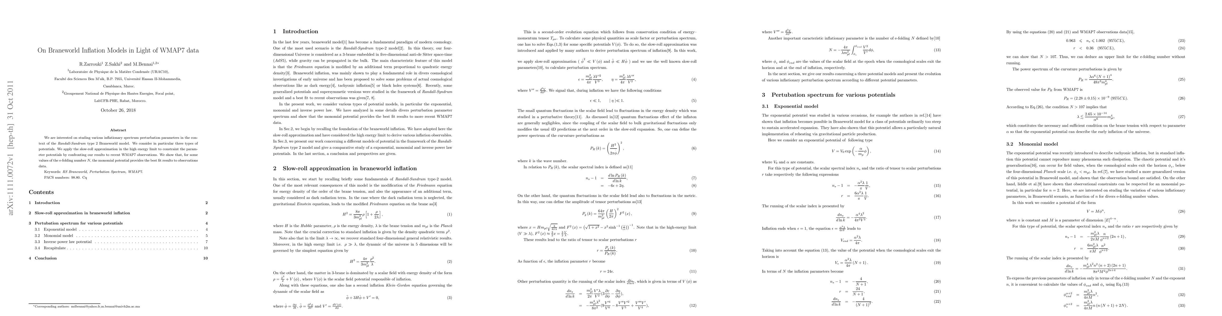 This paper investigates inflationary spectrum perturbations in the Randall-Sandrum type 2 Braneworld model using three potential types and the slow-roll approximation. It compares model predictions to WMAP7 data, finding that the monomial potential offers the best fit for certain e-folding numbers.