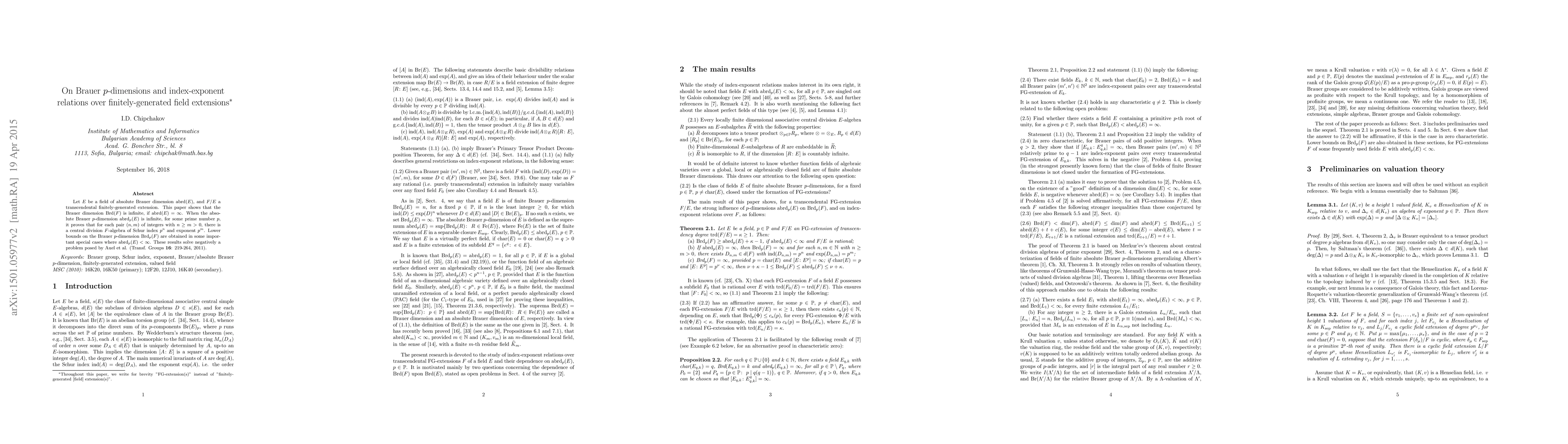 Let $E$ be a field of absolute Brauer dimension abrd$(E)$, and $F/E$ a transcendental finitely-generated extension. This paper shows that the Brauer dimension Brd$(F)$ is infinite, if abrd$(E) = \infty $. When the absolute Brauer $p$-dimension abrd$_{p}(E)$ is infinite, for some prime number $p$, it proves that for each pair $(n, m)$ of integers with $n \ge m > 0$, there is a central division $F$-algebra of Schur index $p ^{n}$ and exponent $p ^{m}$. Lower bounds on the Brauer $p$-dimension Brd$_{p}(F)$ are obtained in some important special cases where abrd$_{p}(E) < \infty $. These results solve negatively a problem posed by Auel et al. (Transf. Groups {\bf 16}: 219-264, 2011).