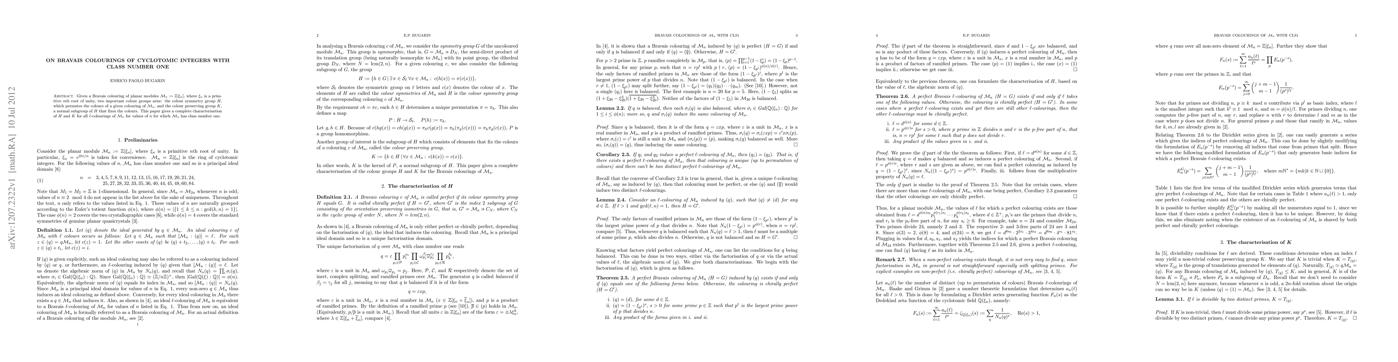 This paper characterizes the colour symmetry group $H$ and the colour preserving group $K$ for Bravais colourings of planar modules $\M_n$ when $\M_n$ has class number one, focusing on $\ell$-colourings of cyclotomic integers associated with primitive $n$th roots of unity.