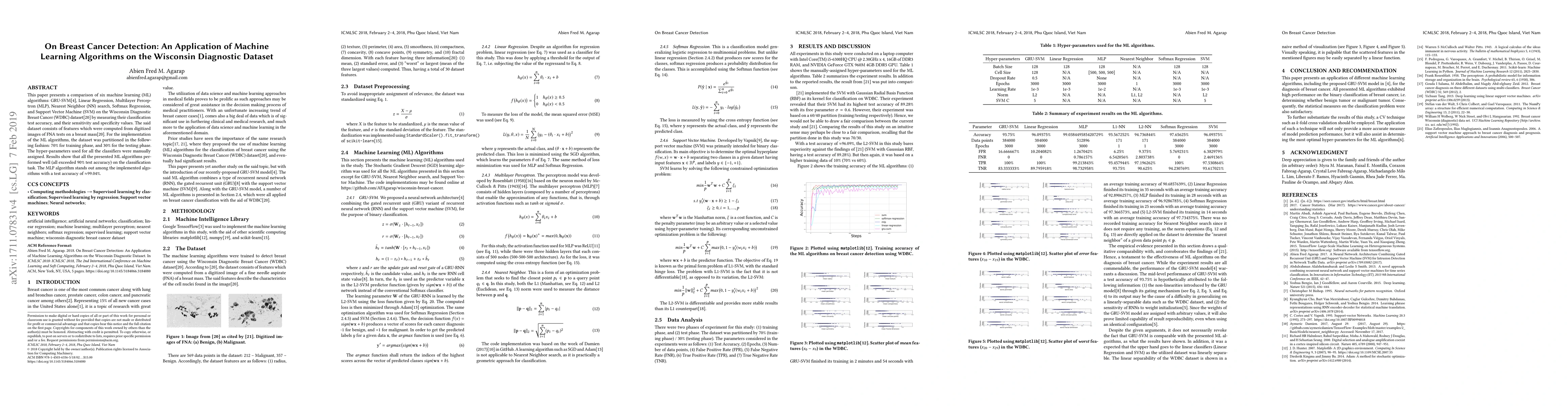 This paper presents a comparison of six machine learning (ML) algorithms: GRU-SVM (Agarap, 2017), Linear Regression, Multilayer Perceptron (MLP), Nearest Neighbor (NN) search, Softmax Regression, and Support Vector Machine (SVM) on the Wisconsin Diagnostic Breast Cancer (WDBC) dataset (Wolberg, Street, & Mangasarian, 1992) by measuring their classification test accuracy and their sensitivity and specificity values. The said dataset consists of features which were computed from digitized images of FNA tests on a breast mass (Wolberg, Street, & Mangasarian, 1992). For the implementation of the ML algorithms, the dataset was partitioned in the following fashion: 70% for training phase, and 30% for the testing phase. The hyper-parameters used for all the classifiers were manually assigned. Results show that all the presented ML algorithms performed well (all exceeded 90% test accuracy) on the classification task. The MLP algorithm stands out among the implemented algorithms with a test accuracy of ~99.04%.