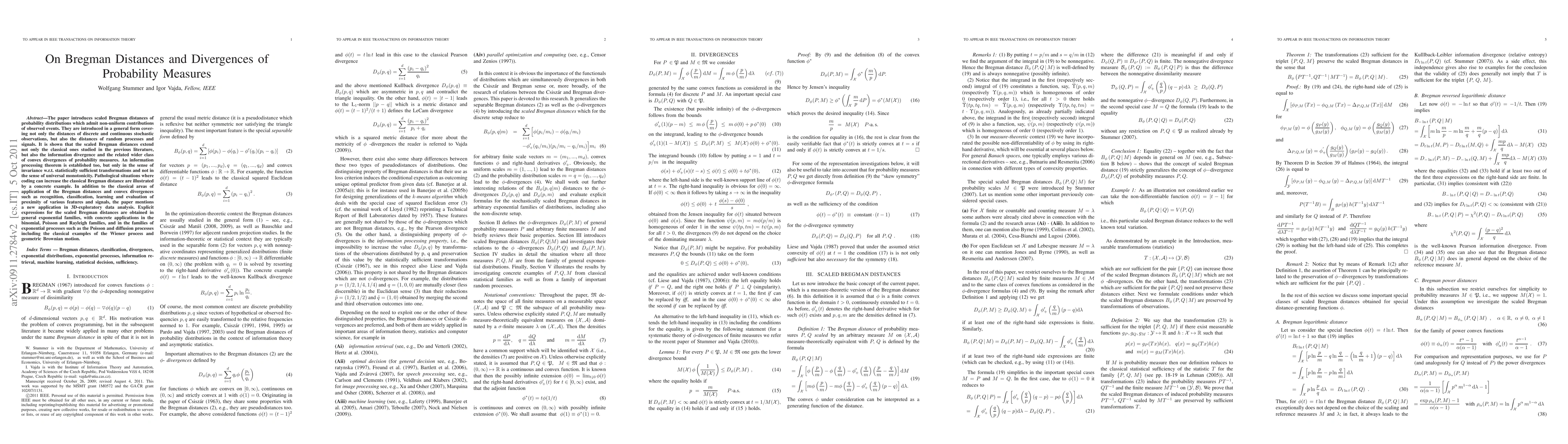 This paper introduces scaled Bregman distances for probability distributions, extending classical distances and information divergences, and applies them to various stochastic observations and processes. It also presents a new application in 3D-exploratory data analysis and provides explicit expressions for these distances in several exponential families.