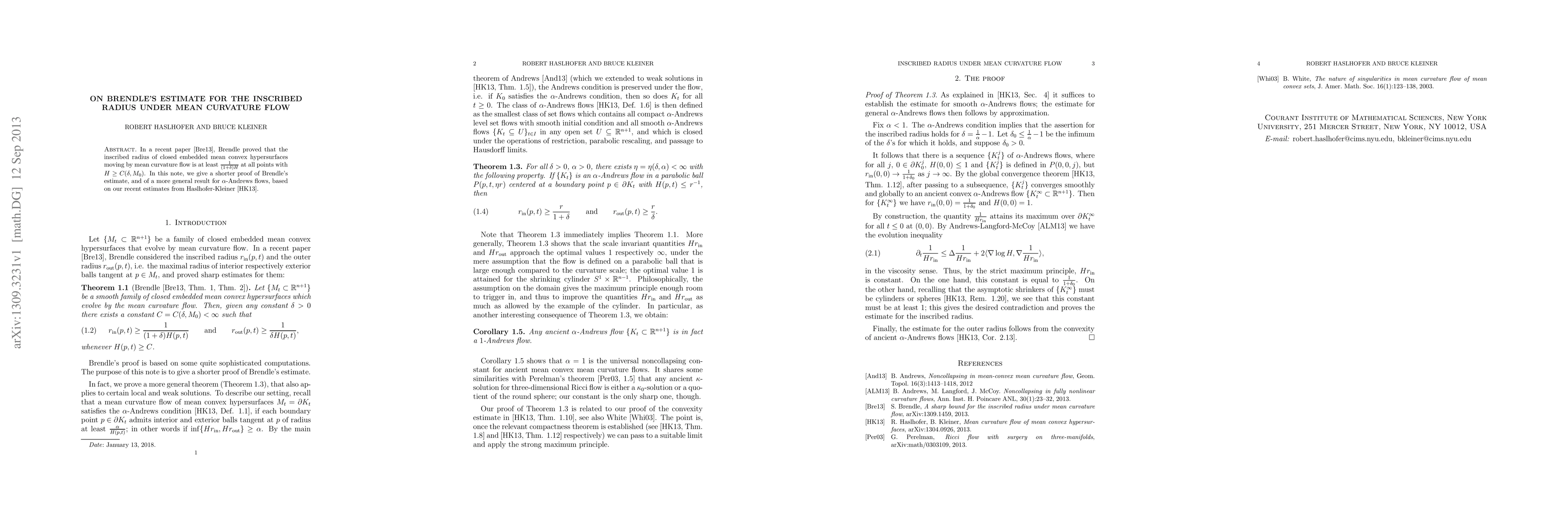 In a recent paper, Brendle proved that the inscribed radius of closed embedded mean convex hypersurfaces moving by mean curvature flow is at least 1/((1+\delta)H) at all points with H > C(\delta,M_0). In this note, we give a shorter proof of Brendle's estimate, and of a more general result for alpha-Andrews flows, based on our recent estimates from Haslhofer-Kleiner.